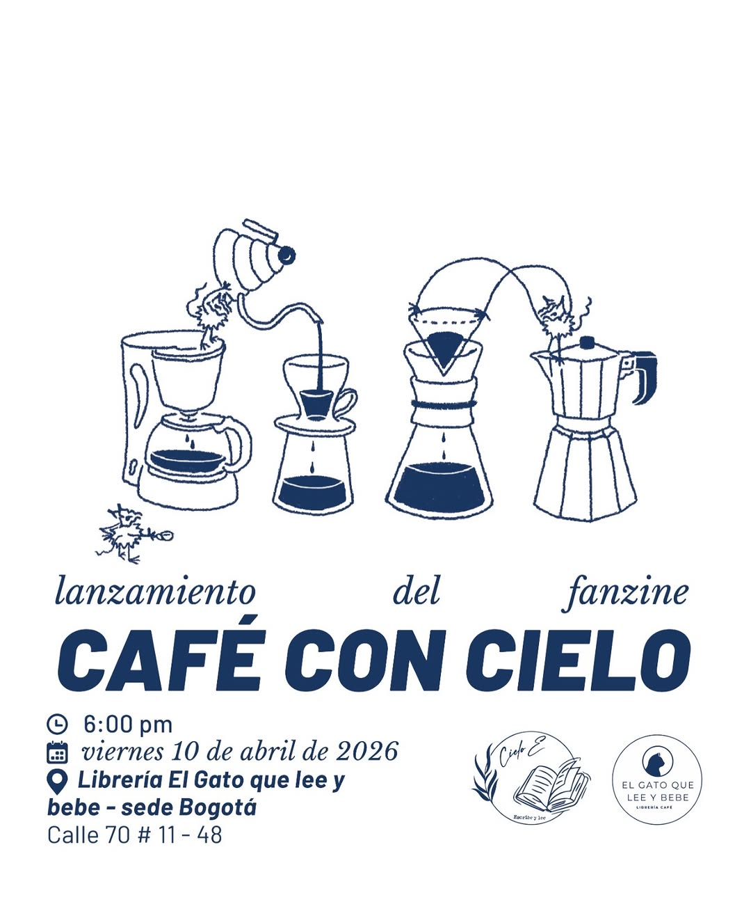 El lanzamiento del fanzine CAFÉ CON CIELO es una actividad literaria y creativa en la librería El Gato que lee y bebe en Bogotá, realizada en colaboración con el Laboratorio de Afectaciones La Fe. Será un encuentro íntimo para conocer el proceso de creación del fanzine, conversar alrededor del café y la escritura, y adquirir ejemplares. Un espacio para compartir, celebrar la autogestión editorial y conectar con amantes de la literatura y el café en la ciudad.