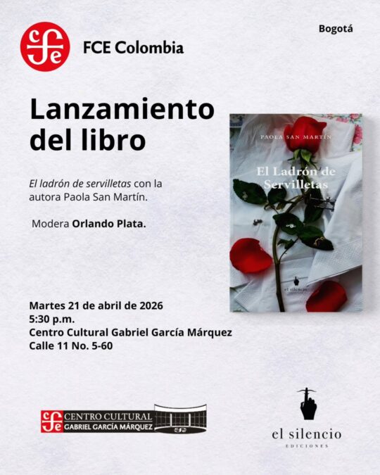El lanzamiento del libro El ladrón de servilletas es una actividad de literatura en Bogotá que se realiza en el marco de FILBo Ciudad, con la autora Paola San Martín y la participación de Ediciones El Silencio y FCE Colombia. Será un espacio íntimo para conversar sobre la novela, escuchar a sus creadores y acercarse a un catálogo independiente que privilegia la reflexión y la lectura pausada.