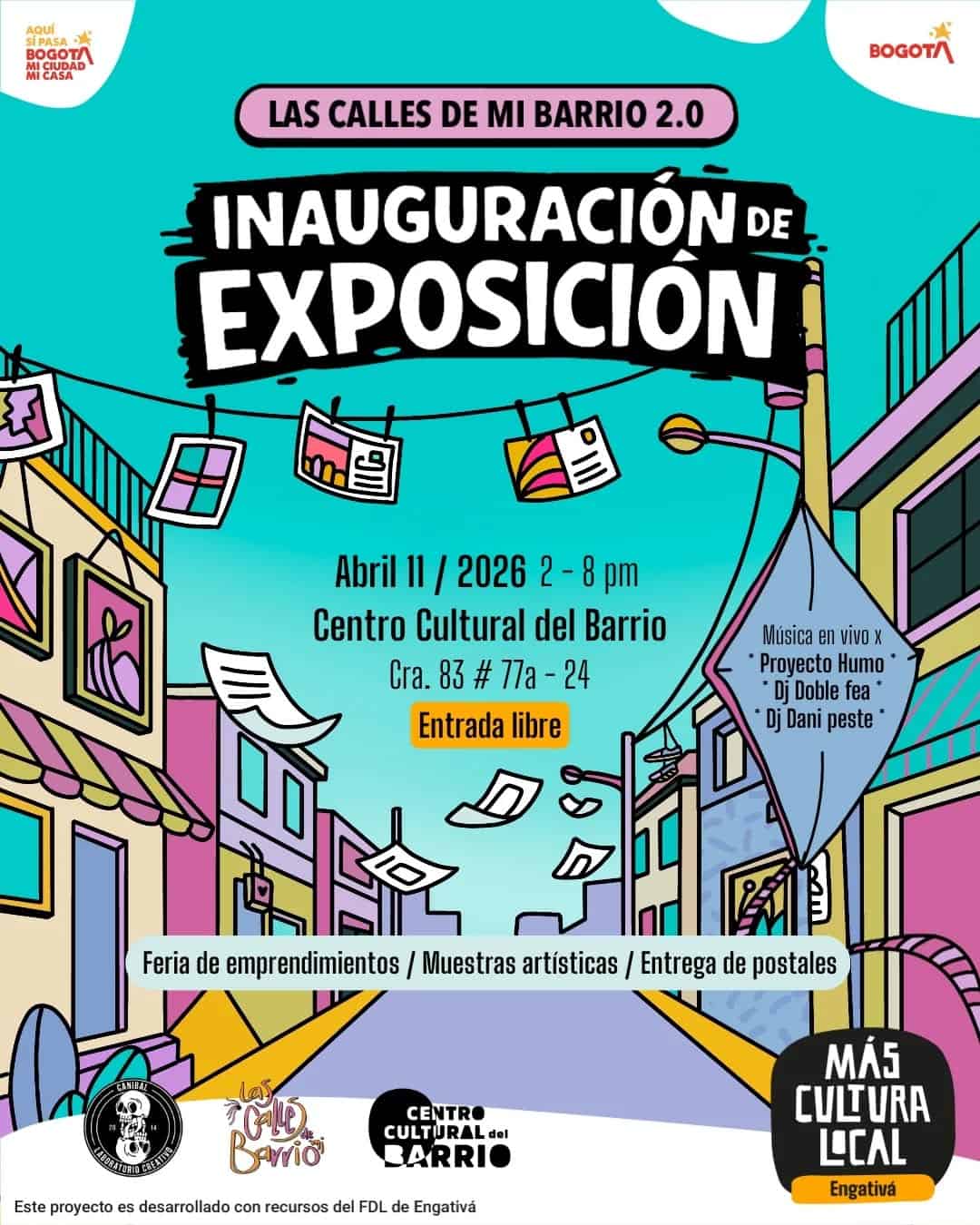 Las Calles de Mi Barrio 2.0 es una exposición colectiva en el Centro Cultural del Barrio en Bogotá, donde el proceso creativo comunitario de Engativá se convierte en gráfica, postales y memoria. El evento reúne a múltiples artistas visuales y musicales como Proyecto Humo, DJ Doble Fea y Dani Pestes, además de feria de emprendimientos y muestras artísticas. Es una experiencia cultural para conocer otras miradas sobre el barrio y celebrar la creación local.