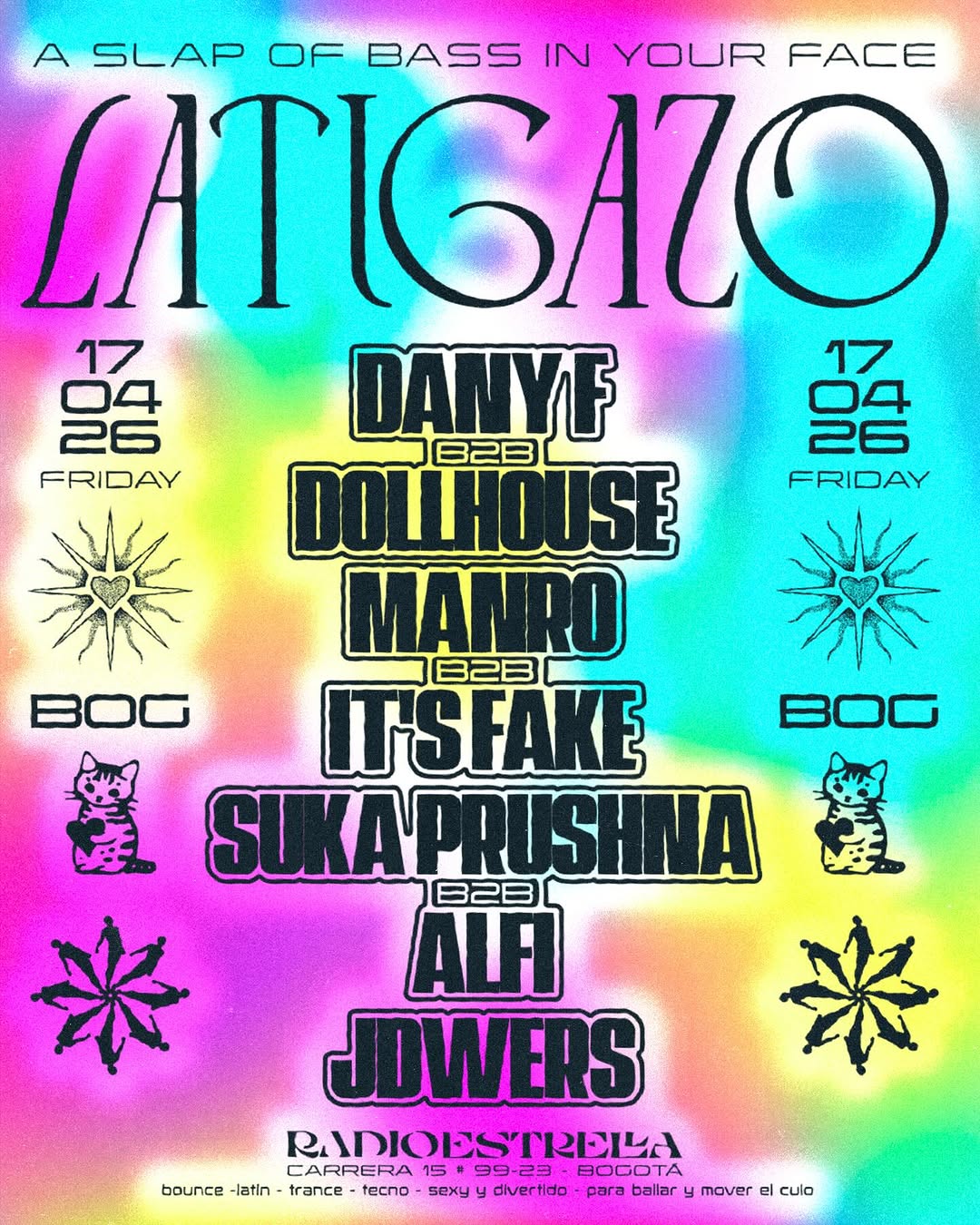 LATIGAZO llega a la cabina de Radio Estrella en Bogotá con una noche de DJ set y clubbing enfocada en trance, bounce, bass y ritmos latinos para perrear y sudar la pista. DANYF, Dollhouse, Manro, It’s Fake, Sukaprushna, Alfi y Jowers se unen en varios B2B para una experiencia sexy, intensa y muy bailable. Un plan perfecto para amantes del bajo pesado y la electrónica underground en la ciudad.