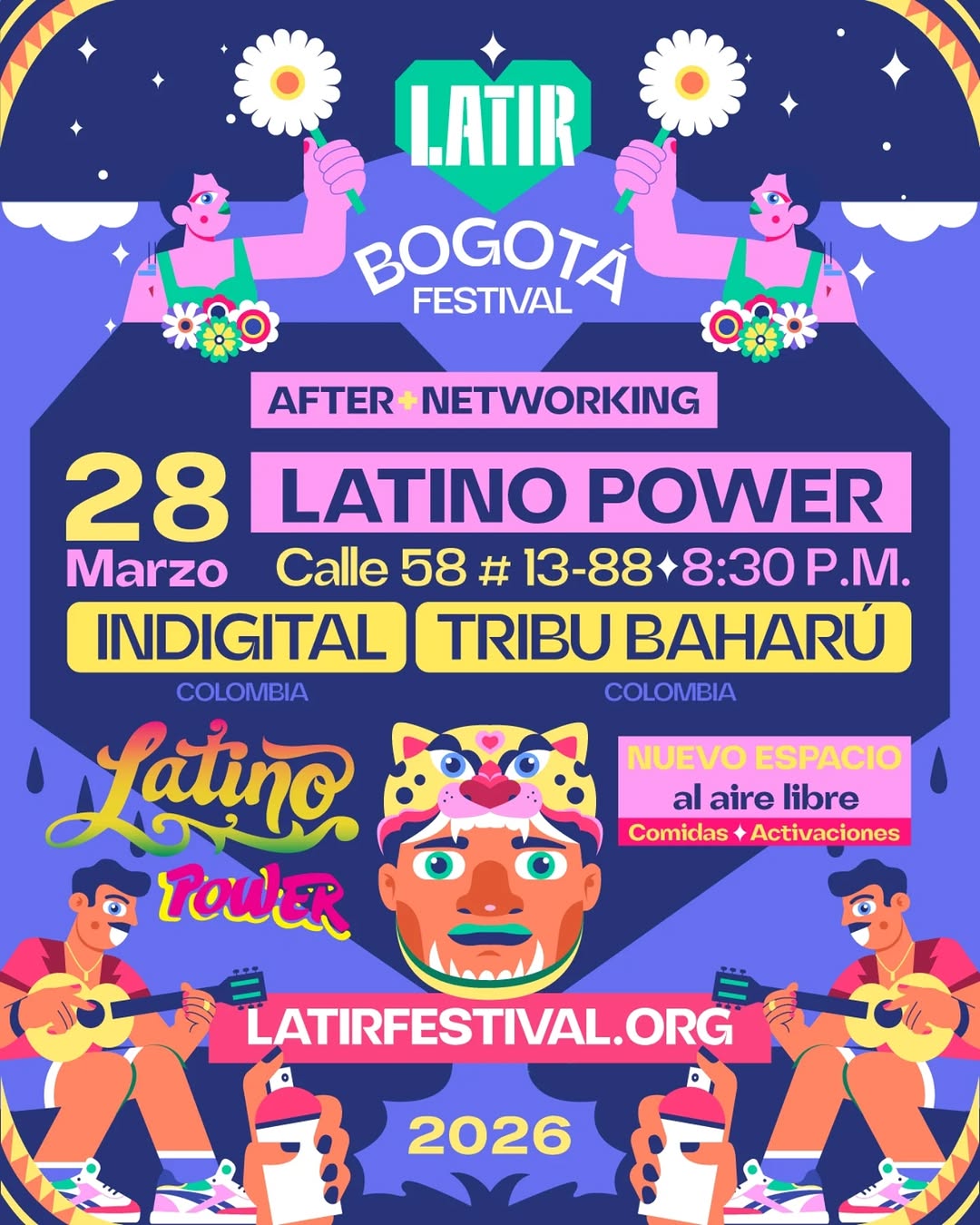 LATIR BOGOTA FESTIVAL AFTER NETWORKING LATINO POWER llega a Bogotá con una noche para conectar, bailar y disfrutar. Este after networking reúne a la banda Tribu Baharú y al proyecto Indigital en un espacio al aire libre con comidas y activaciones, ideal para hacer contactos mientras gozas de buena música y ambiente festivo en Latino Power Chapinero.