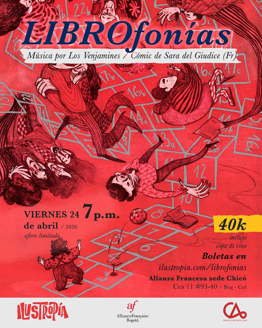 LIBROfonías es una experiencia escénica en Bogotá donde la música y el cómic se fusionan en vivo. Fragmentos de las historietas de la artista Sara del Giudice se interpretan mientras suenan las composiciones de Los Venjamines, creando una forma distinta de entrar a una historia. Organizado por Ilustropía en la Alianza Francesa sede Chicó, este evento de música y cómic invita a disfrutar también de vino, dibujo y conversación relajada alrededor de la lectura ilustrada.