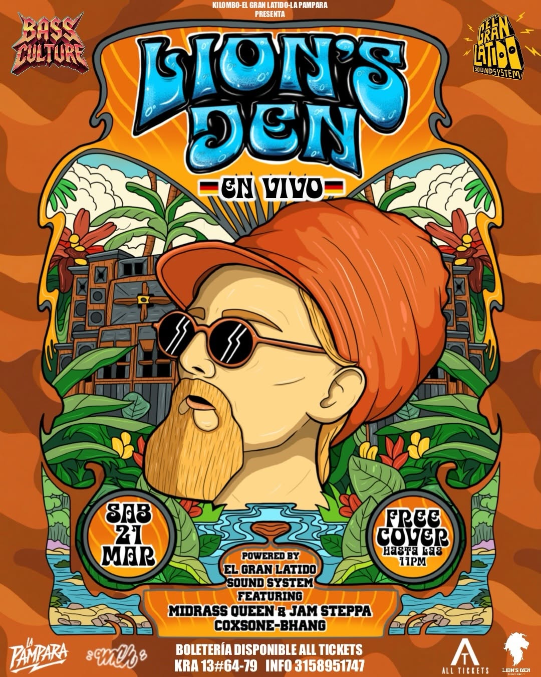 LION’S DEN EN VIVO llega a Bogotá como una noche dedicada a la cultura sound system y al dub, con el poder de El Gran Latido Sound System retumbando en La Pampara. Este concierto reúne a Midras Queen, Jamm Steppa y Coxsone-Bhang en un encuentro de bajos profundos, vibración consciente y conexión con la raíz. Un plan ideal para amantes del bass culture y el sonido jamaicano en la ciudad.