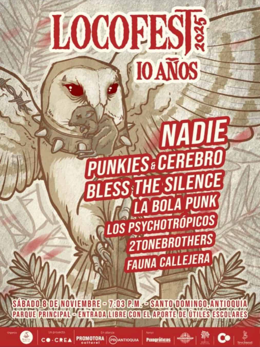 ¡LOCOFEST 2025 celebra su décimo aniversario a lo grande! Diez años de música, revolución cultural y energía colectiva. Este festival alternativo regresa con más fuerza que nunca, celebrando punk, rock y ska. Disfruta de bandas como Nadie Rock, Punkies, Cerebro, Bless the Silence, La Bola Punk, Los Psychotrópicos, 2Tone Brothers y Fauna Callejera. LOCOFEST es más que música: es una causa social, un grito de identidad y comunidad. No te pierdas esta experiencia única el 8 de noviembre de 2025, donde la conexión entre el público y los artistas será electrizante.