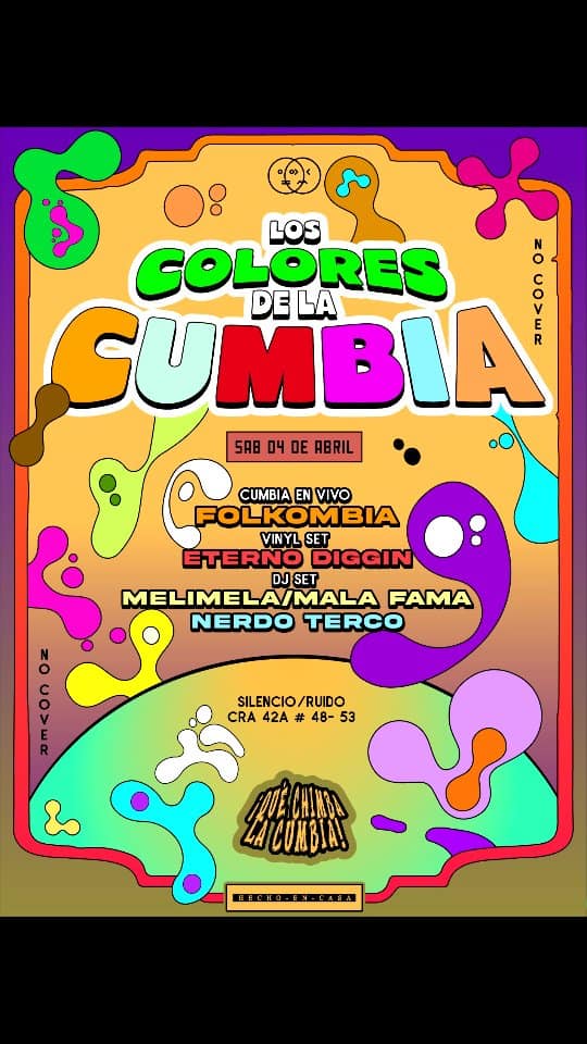 Los Colores de la Cumbia es una noche dedicada a la cumbia en vivo y a los sonidos tropicales en Silencio/Ruido, en Medellín. La banda Folkombia lidera el show en vivo, acompañada por un viaje musical en vinilo a cargo de Untumbaosabroso y sets de DJ de Melimel, Nina Folklore y Nerdo Terco. Un encuentro para bailar, explorar la cumbia en diferentes formatos y disfrutar de una experiencia festiva y muy colombiana.