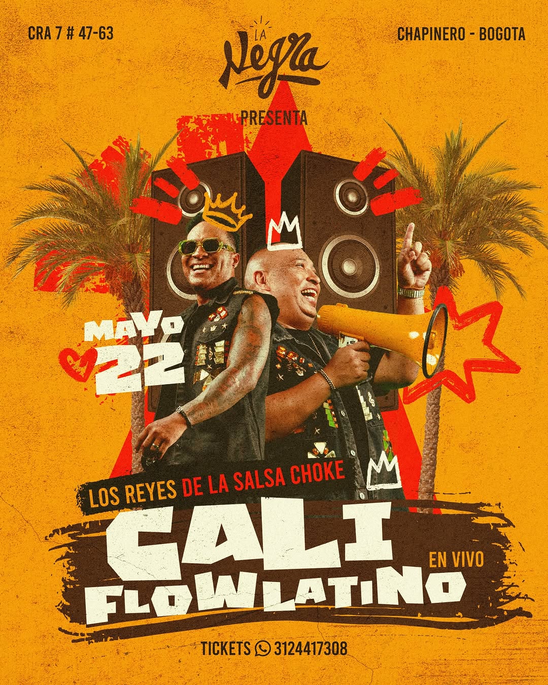 Los Reyes de la Salsa Choke – Cali Flow Latino en Vivo llega a La Negra en Bogotá para una noche de pura salsa choke y sabor urbano. Cali Flow Latino se presenta en concierto en un ambiente de rumba intensa, pensado para ir con el parche y bailar sin parar. Este evento promete una experiencia cercana con la agrupación, energía alta en la pista y una fiesta distinta en Chapinero para amantes de la salsa choke y la música en vivo.