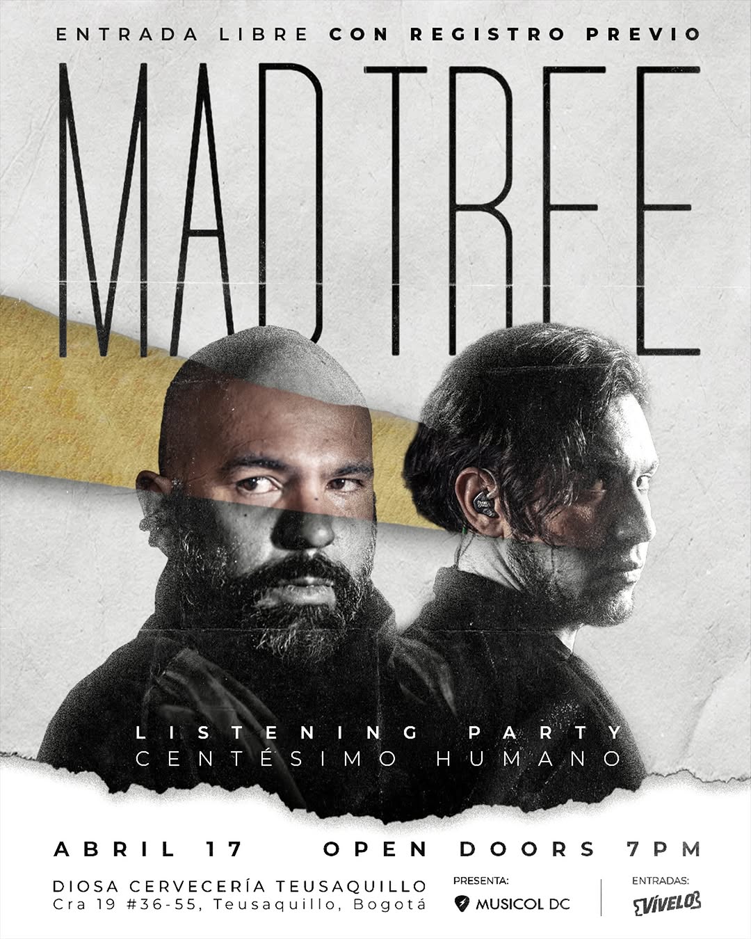 MADTREE celebra los 10 años de su trabajo Centésimo Humano con una listening party especial en Bogotá. En MADTREE LISTENING PARTY CENTÉSIMO HUMANO podrás compartir con otros fans, escuchar el álbum en detalle y vivir una experiencia íntima guiada por la banda y MUSICOL DC. Es una actividad musical ideal para quienes disfrutan descubrir matices de la producción y las historias detrás de las canciones en un ambiente cercano.