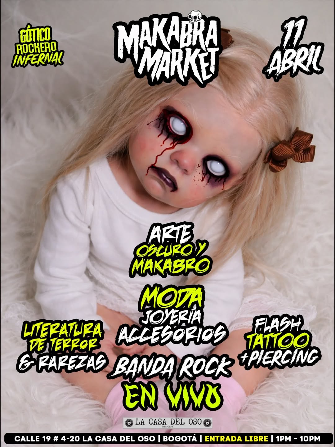 Makabra Market llega a La Casa del Oso en Bogotá con una edición dedicada al rock, la estética oscura y el arte alternativo. Este mercado artesanal y cultural reúne propuestas de moda gótica, joyería, accesorios, literatura de terror, rarezas y arte oscuro, además de banda de rock en vivo, flash tattoo y piercing. Es un espacio ideal para amantes de lo macabro, lo místico y lo rockero que buscan un plan diferente en la ciudad.