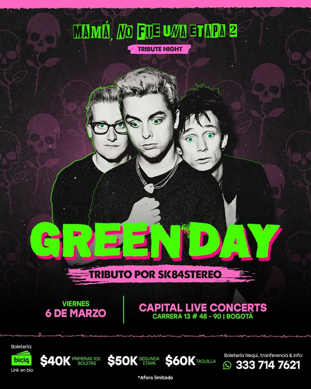Prepárate para una noche llena de energía y nostalgia en Bogotá. El evento ‘Mamá, No Fue Una Etapa 2 – Tribute Night’ te llevará en un viaje musical con el tributo a Green Day realizado por SK84STEREO. Este concierto tributo, que se llevará a cabo en Capital Live Concerts, promete ser una experiencia inolvidable para los amantes del rock y punk. No te pierdas esta oportunidad de revivir los grandes éxitos de Green Day en una noche que promete ser inolvidable.