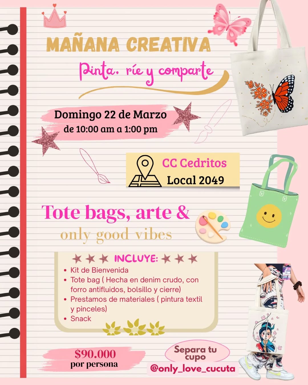 Mañana Creativa es un taller de pintura sobre tela en Bogotá donde podrás diseñar y personalizar tu propia tote bag en denim crudo. En este espacio creativo en el Centro Comercial Cedritos, recibirás acompañamiento paso a paso, un kit de bienvenida, materiales de pintura textil, snack y detalles sorpresa. Es una actividad artística ideal para desconectarte, compartir buen ambiente y explorar tu lado creativo mientras creas una pieza única.