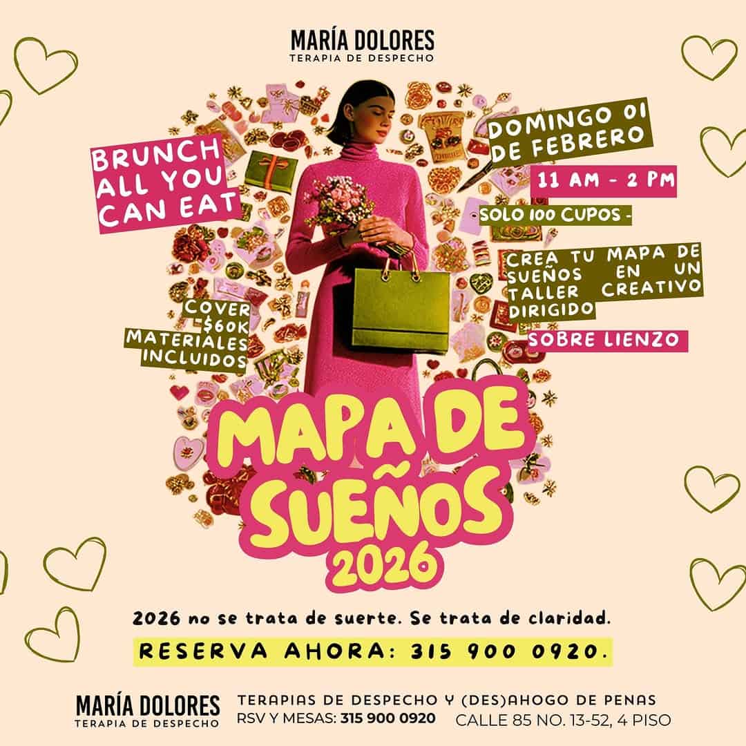 El evento ‘Mapa de Sueños 2026’ es un taller creativo y brunch en el lugar María Dolores – Terapia de Despecho en Bogotá. Este evento único ofrece una experiencia de brunch ilimitado mientras participas en un taller creativo dirigido sobre lienzo para crear tu propio mapa de sueños. Con solo 100 cupos disponibles, este evento promete ser una experiencia íntima y enriquecedora. Además, María Dolores ofrece terapias de despecho y (des)ahogo de penas, lo que añade un toque especial a este evento.