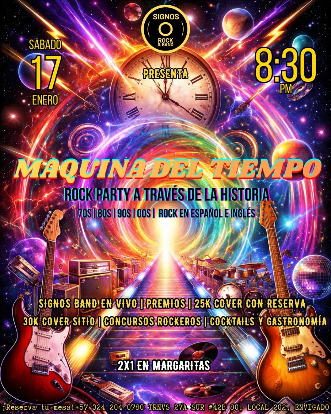 Este sábado, súbete a la Máquina del Tiempo en Signos, Envigado. Un viaje musical por la historia del rock and roll, desde los sonidos clásicos hasta los dosmiles. Disfruta de una noche llena de rock en inglés y español, interpretado por la banda en vivo Signos Band. Además, aprovecha la promoción 2×1 en margaritas. ¡No te lo pierdas!