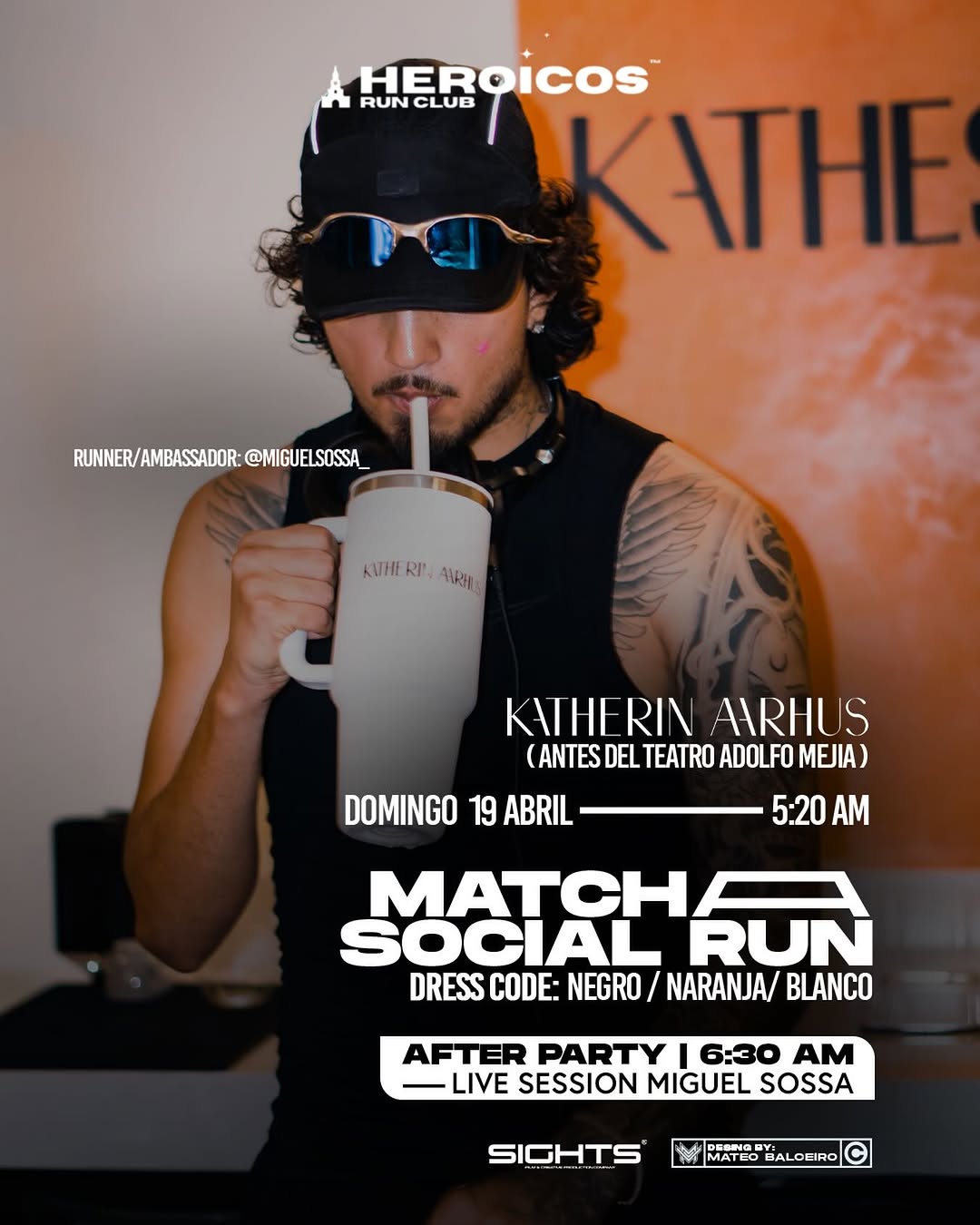 Match Social Run es una rodada social de running en Cartagena que combina deporte, fiesta y buena música en una sola mañana. Organizado por Heroicos Run Club en Katherin Arhus, los participantes pueden elegir entre distancias de 3, 6 o 9K y luego disfrutar de un after party con live session de Miguel Sossa, hidratación, matcha o cold brew y un ambiente energético ideal para corredores y amantes del fitness.