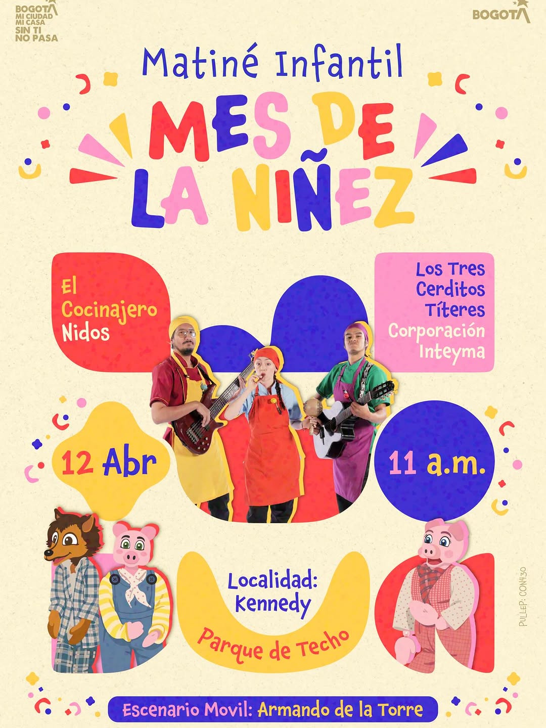 Matiné Infantil MES DE LA NIÑEZ es una jornada dedicada a la imaginación y el juego para niños y familias en Bogotá. En este evento infantil, el Escenario Móvil Armando de la Torre llega al Parque de Techo con propuestas artísticas como El Cocinajero Nidos, Los Tres Cerditos Títeres y la Corporación Inteyma. Será una mañana para disfrutar de arte, cuentos y actividades lúdicas que celebran la niñez bogotana en un ambiente creativo y cercano a la comunidad.