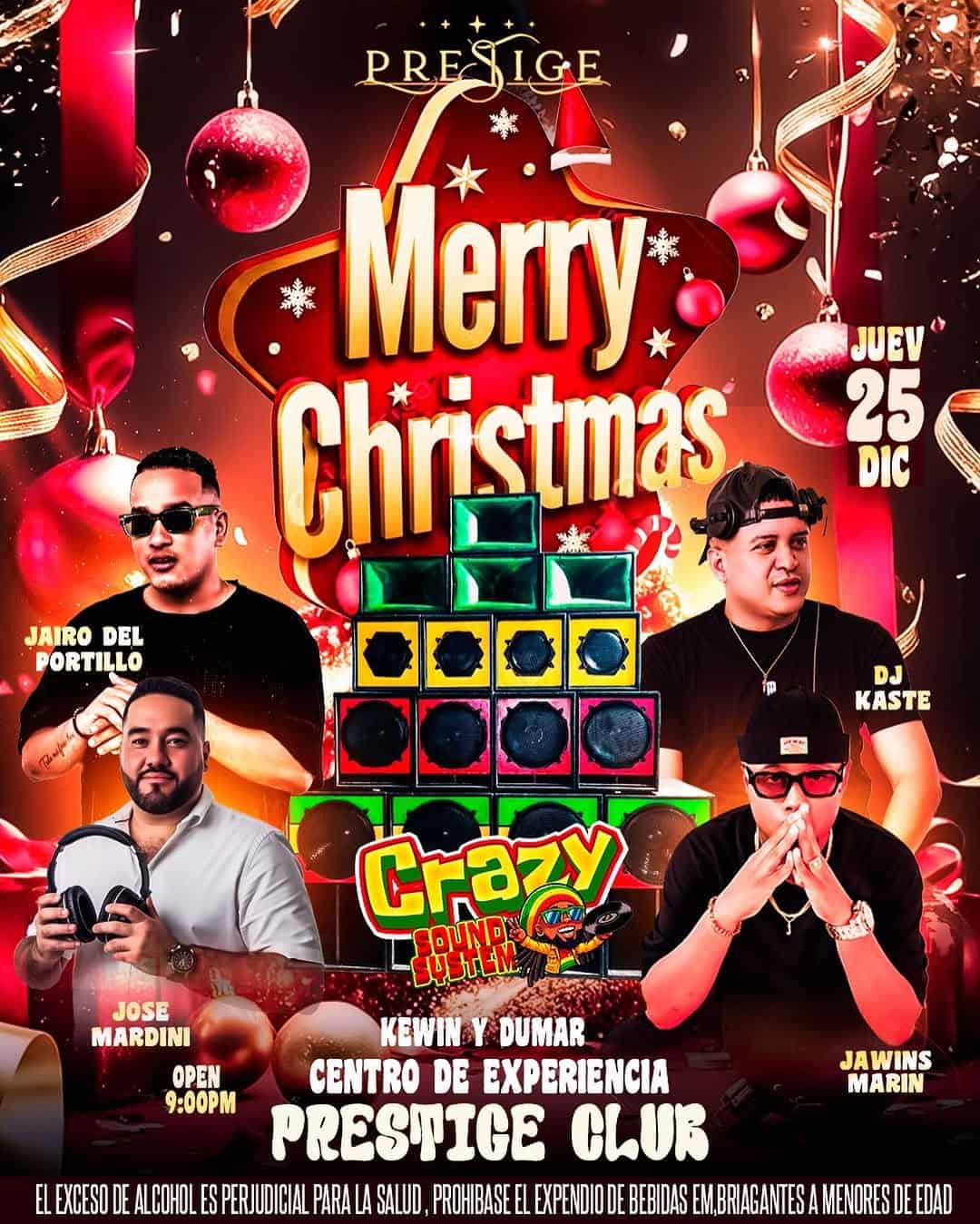 ¡Prepárate para una noche inolvidable en Prestige Club! Este 25 de diciembre, celebraremos la Navidad con una fiesta llena de luz, alegría y buena energía. Contaremos con la música urbana y reggaeton de DJ Kaste, DJ José Mardini, DJ Jairo Del Portillo y DJ Jawins Marin. Además, el ambiente estará amenizado por Crazy Sound System. ¡No te lo pierdas, te esperamos para seguir celebrando juntos!