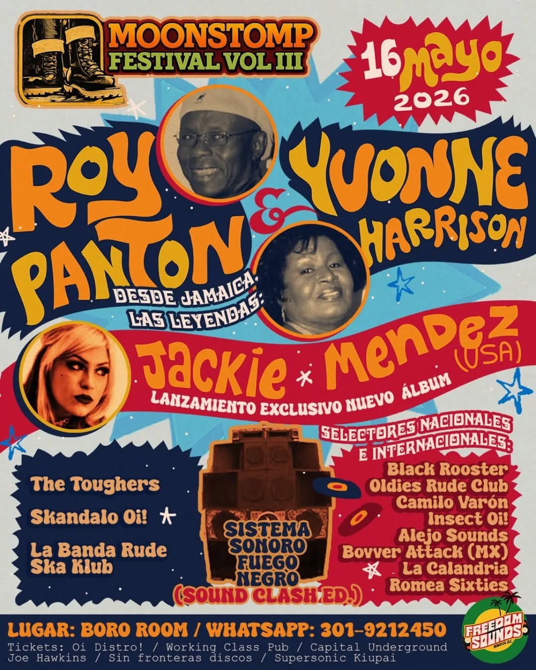 Moonstomp Festival Vol III llega a BORO ROOM como una celebración de la música jamaicana en Bogotá, reuniendo ska, rocksteady y reggae en una sola noche. El cartel incluye a las leyendas Roy Panton & Yvonne Harrison desde Jamaica, el lanzamiento del primer LP de Jackie Méndez desde Los Ángeles y bandas colombianas como The Toughers, Skandalo Oi! y Rude Ska Klub, además de un sound clash con Sistema Sonoro Fuego Negro y selectores nacionales e internacionales.