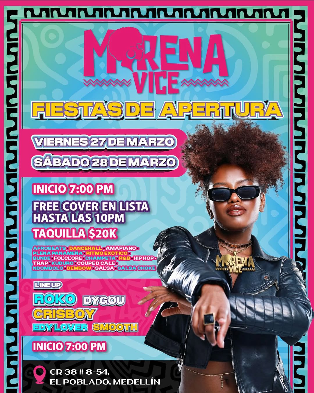 MORENA VICE – FIESTAS DE APERTURA es una fiesta de DJ set en Medellín que celebra los ritmos afro y urbanos con un line up de DJs como Crisboy, Eddy Lover, Smooth, Dygou y Roko. Este evento de clubbing reúne afrobeats, dancehall, amapiano, champeta, R&B, hip hop y más, creando una experiencia intensa de baile y fiesta en la ciudad. Ideal para quienes buscan una noche con sonidos globales y ambiente encendido.