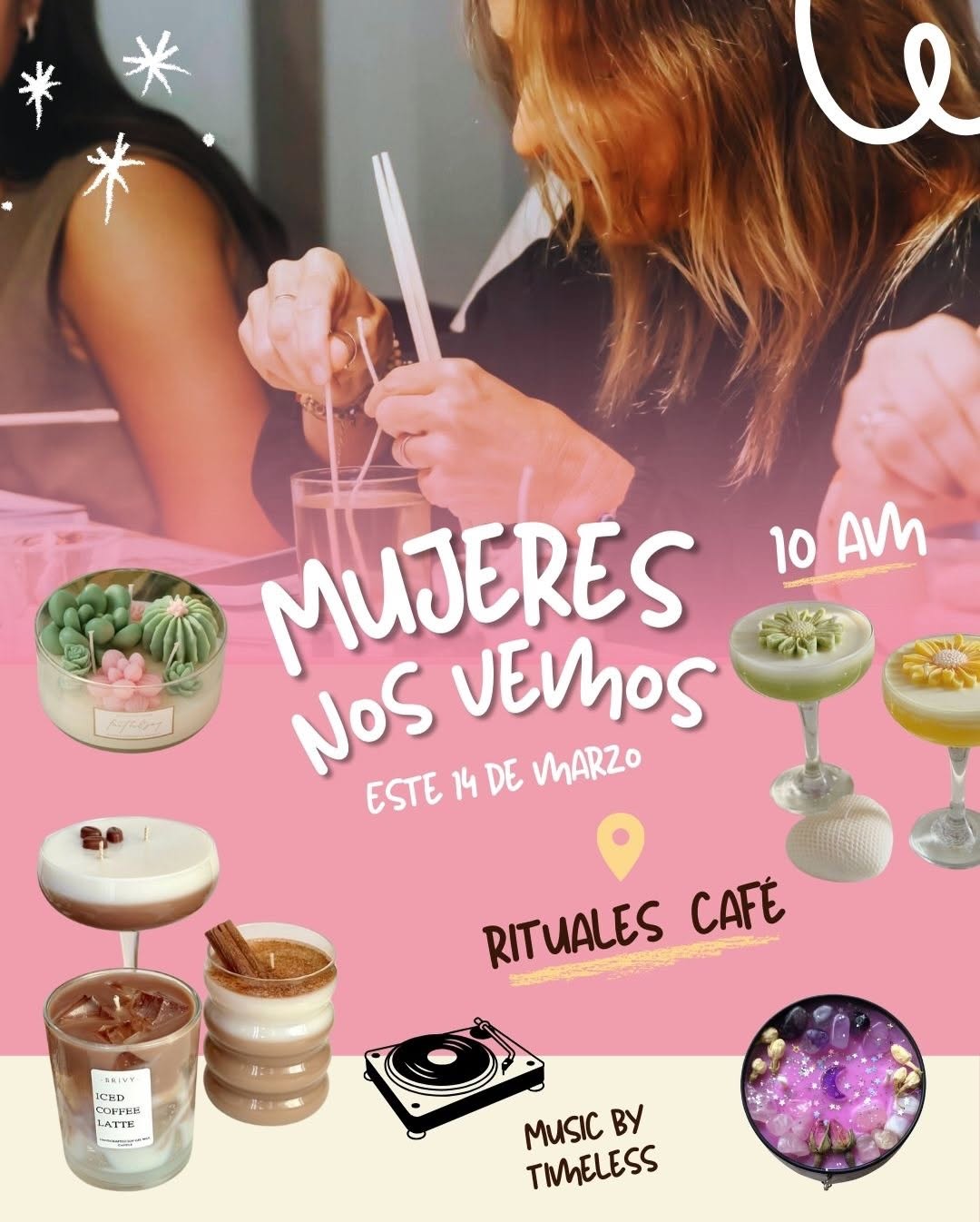 MUJERES NOS VEMOS es un club de arte en Rituales Café donde las asistentes crean su propia vela intencionada y se regalan una pausa consciente. Este taller bienestar en formato creativo ofrece música en vivo, snacks y un espacio íntimo para conectar con otras mujeres y su energía creadora en la ciudad. Podrás elegir entre velas con cuarzos, tipo café o estilo jardín de suculentas, en una experiencia cálida y simbólica.