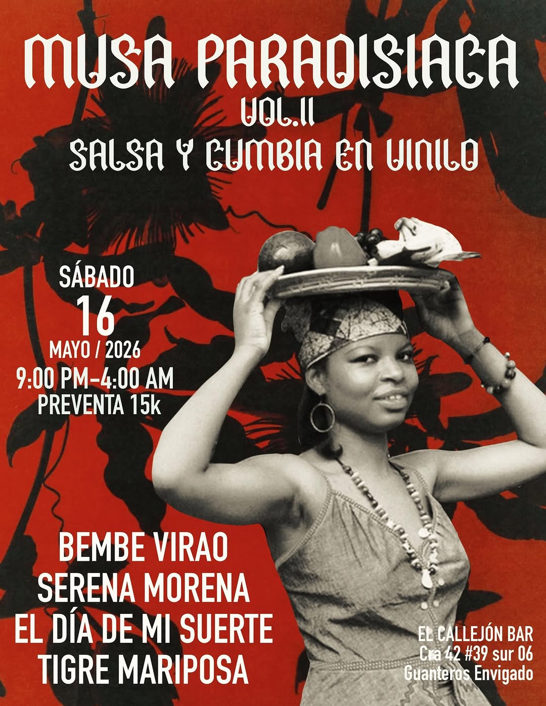 Musa Paradisiaca Vol. II es una noche dedicada a la salsa y la cumbia en vinilo, con una selección tropical y bailable curada por Montañez, Serena Morena, El Día de Mi Suerte, Tigre Mariposa y la invitada especial Bembé Virao. En El Callejón Bar, en Envigado, este evento ofrece una experiencia íntima para amantes del vinilo y los ritmos latinos, ideal para quienes buscan una fiesta musical auténtica cerca de Medellín.