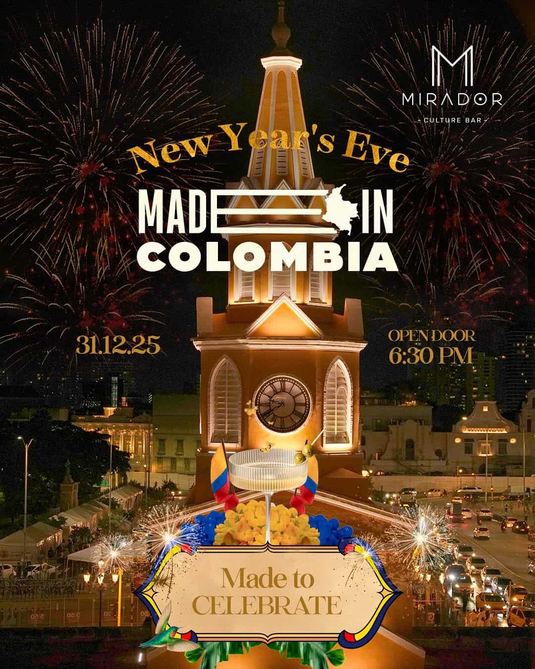 Celebra una Nochevieja inolvidable en Cartagena, Colombia, en el Mirador Culture Bar. Disfruta de una noche mágica con una vista privilegiada del Centro Histórico, espectáculos en vivo, orquesta, barra libre premium y tradiciones colombianas que hacen de este destino algo verdaderamente único. Un viaje de cultura, música y alegría en la ciudad más encantadora del Caribe. Reserva ahora y asegura tu lugar para esta experiencia exclusiva para dar la bienvenida al 2026.