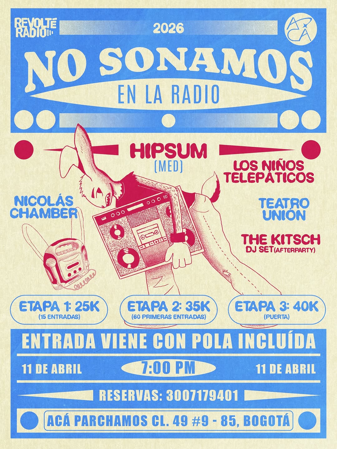 NO SONAMOS EN LA RADIO es una noche de concierto y dj set en el Teatro Unión de Bogotá, donde el ruido, la introspección y los paisajes sonoros se encuentran. El evento reúne a Hipsum, Los Niños Telepáticos, Nicolás Chamber y The Kitsch en un afterparty en formato DJ set, para un parche íntimo y alternativo que celebra los 10 años del Teatro Unión. Una experiencia musical independiente ideal para quienes buscan propuestas frescas en la escena bogotana.