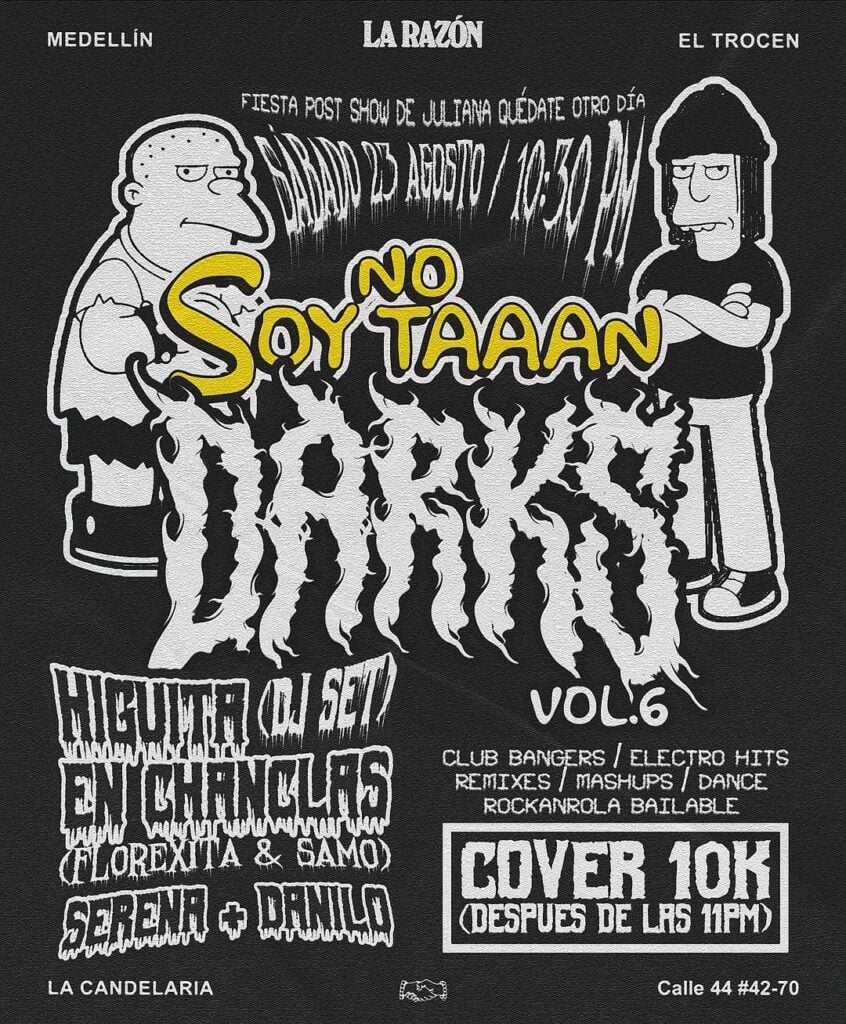 Este sábado 23 de agosto vuelve la 🎩FIESTA QUE TANTO TE GUSTA 🧛♂️🕇”No Soy Tan Darks vol.6” (después del toque de @julianaquedateotrodia) 🎼🎧… Con un combo de terror @higuitaenchanclas (dj set – @samuelbarahona._ x @florexitaaaaa) / @ojos_de_nube / @dmesa10 … Caiga dispuesto a bailar 💃🏻, saltar y mover el cuerpo toda la noche 🎵 … Inicio: 10:30 pm / Cover 10k (después de las 11pm / la manilla del toque que hay antes es válida para esta fiesta)