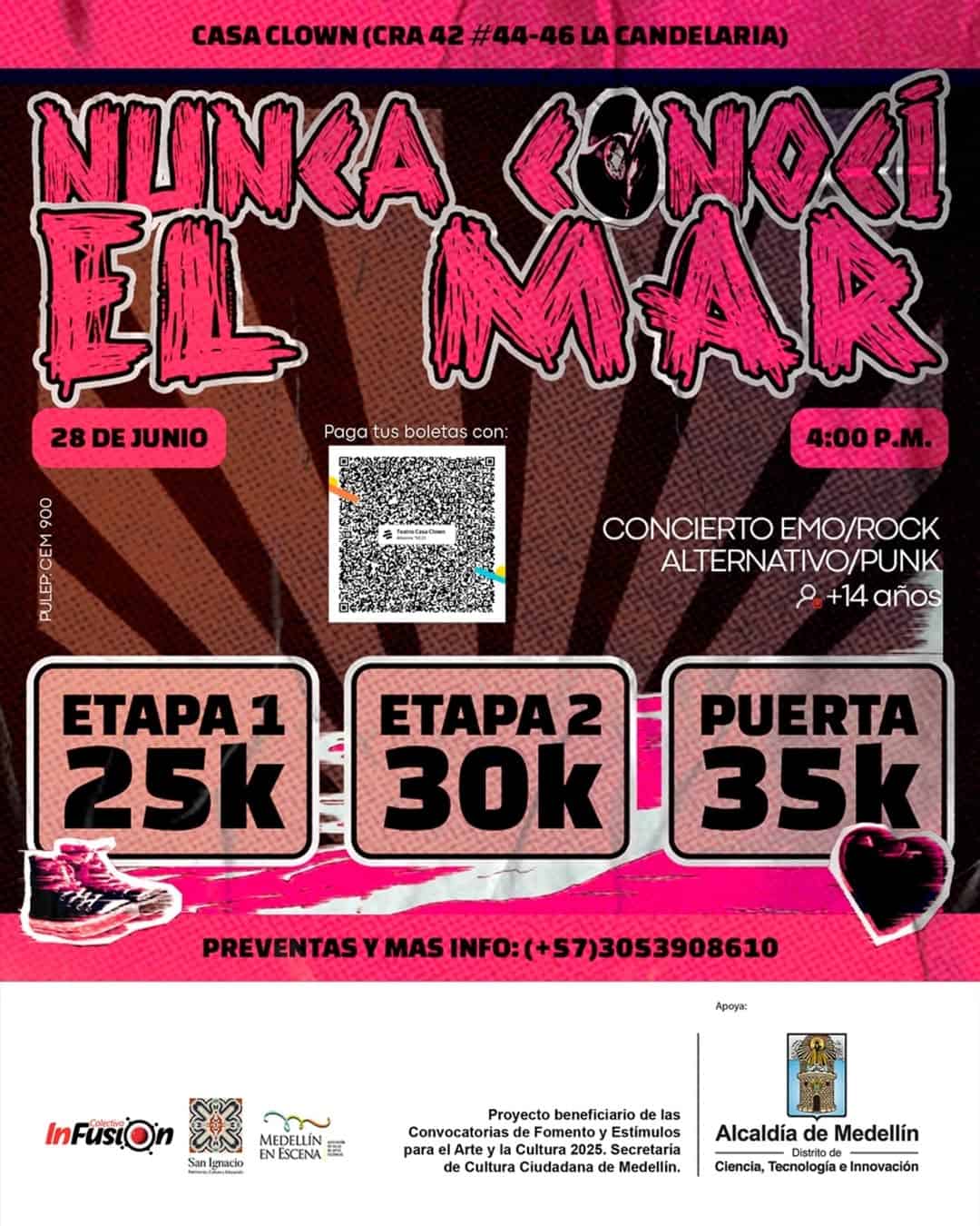 ¡Prepárate para rockear en Medellín con el concierto “NUNCA CONOCÍ EL MAR”! Este evento de comedia y stand-up te llevará a un viaje musical a través de las bandas de rock y emo de Medellín, el oriente antioqueño y Bogotá. ¡No te pierdas la oportunidad de disfrutar de buena música en un ambiente increíble! ¡Ven el 28 de junio de 2025 de 4:00pm a 10:00pm y déjate sorprender! ¡No te arrepentirás!
