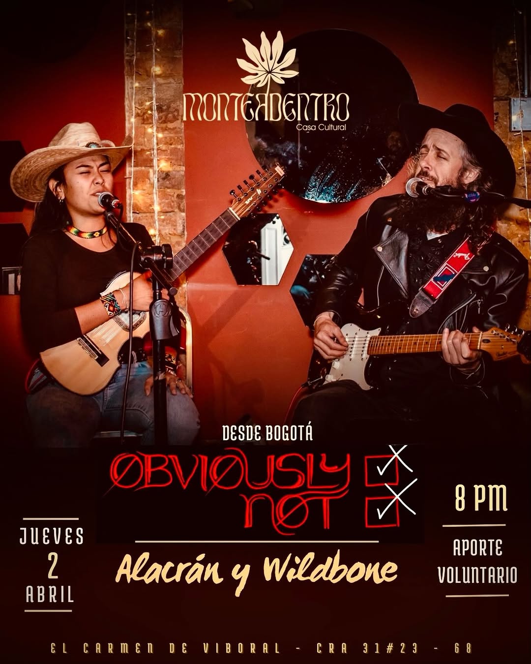 Obviously Not es un proyecto de Alacrán y Wildbone que llega desde Bogotá a Monteadentro en El Carmen de Viboral para un concierto íntimo. La propuesta mezcla músicas de cuerdas montañeras con influencias del caos urbano, creando un diálogo sonoro entre el sur de Norteamérica y el norte de Suramérica. Será una noche para descubrir nuevas fusiones musicales y disfrutar de un formato cercano y experimental en vivo.