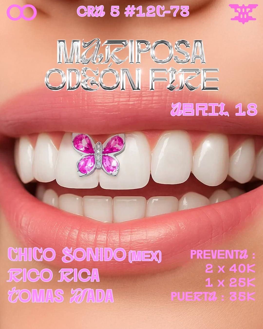 ODEON FIRE X MARIPOSA es una fiesta de neoperreo y dembow en Bogotá que reúne a Chico Sonido desde México junto a Rico y Tomás Nada para una noche intensa de perreo under latino. El evento promete un set cargado de reguetón alternativo, dembow y ritmos urbanos, ideal para quienes buscan una experiencia de clubbing diferente en la ciudad. Una fecha pensada para amantes del perreo futurista y las nuevas corrientes del género urbano.