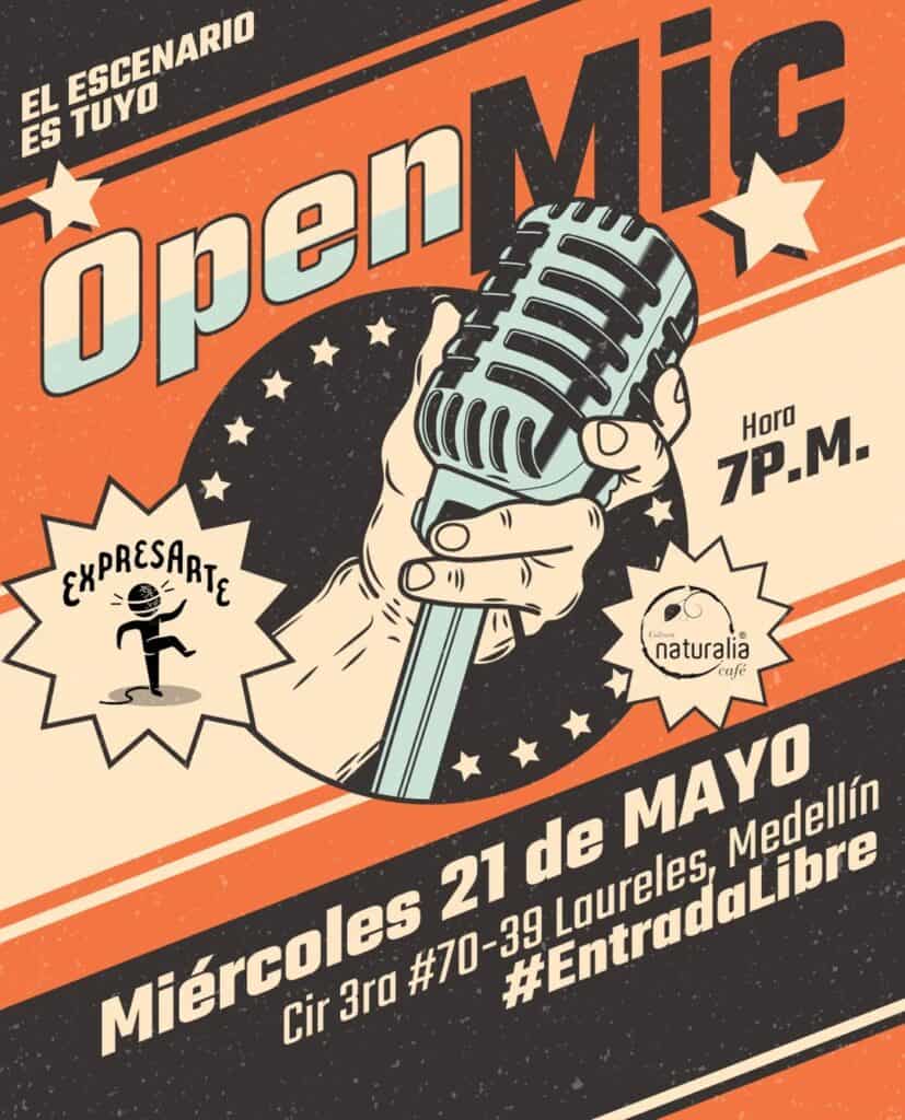 El miércoles 21 de mayo a las 7p.m. tendremos de nuevo Open Mic dónde el escenario es todo tuyo! Música , poesía, comedia, cuentos y todas las expresiones del alma, reunidas en un lugar. #entradalibre Participa escribiéndole a @expresartemedellin
