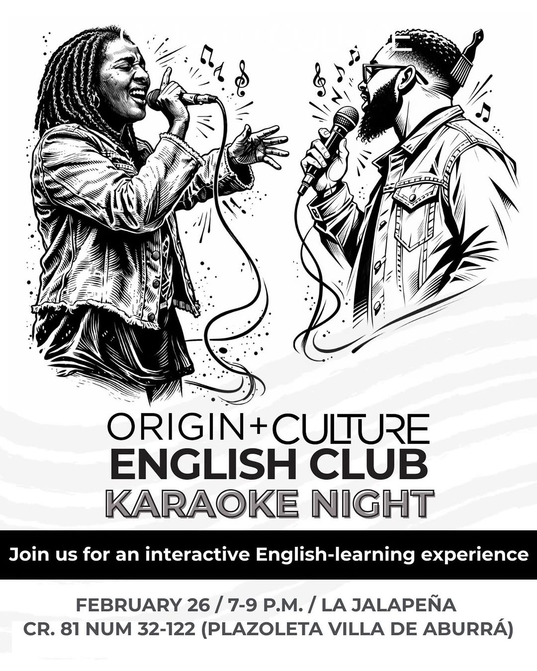 ORIGIN+CULTURE English Club Karaoke Night es una noche para cantar en inglés en La Jalapeña, en Medellín. Es un espacio relajado para practicar el idioma, perder la pena frente al micrófono y compartir con otras personas que quieren aprender inglés de forma divertida. Cada asistente debe elegir su canción con anticipación para asegurarse de subir al escenario y vivir una experiencia participativa y llena de risas.
