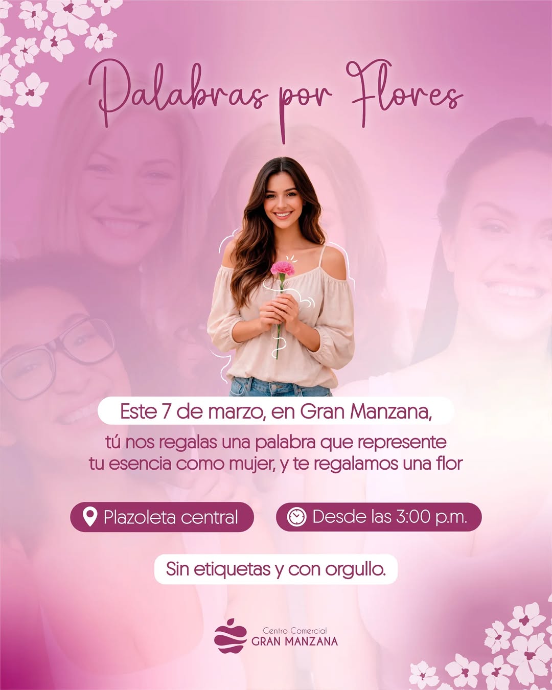 Palabras por Flores es una actividad especial en el Centro Comercial Gran Manzana en la que las mujeres son invitadas a escribir una palabra que represente su esencia y, a cambio, reciben una flor. Este espacio simbólico en Cartagena celebra la identidad femenina sin etiquetas, promoviendo el orgullo, el autocuidado y la expresión personal en un ambiente cercano y emotivo.