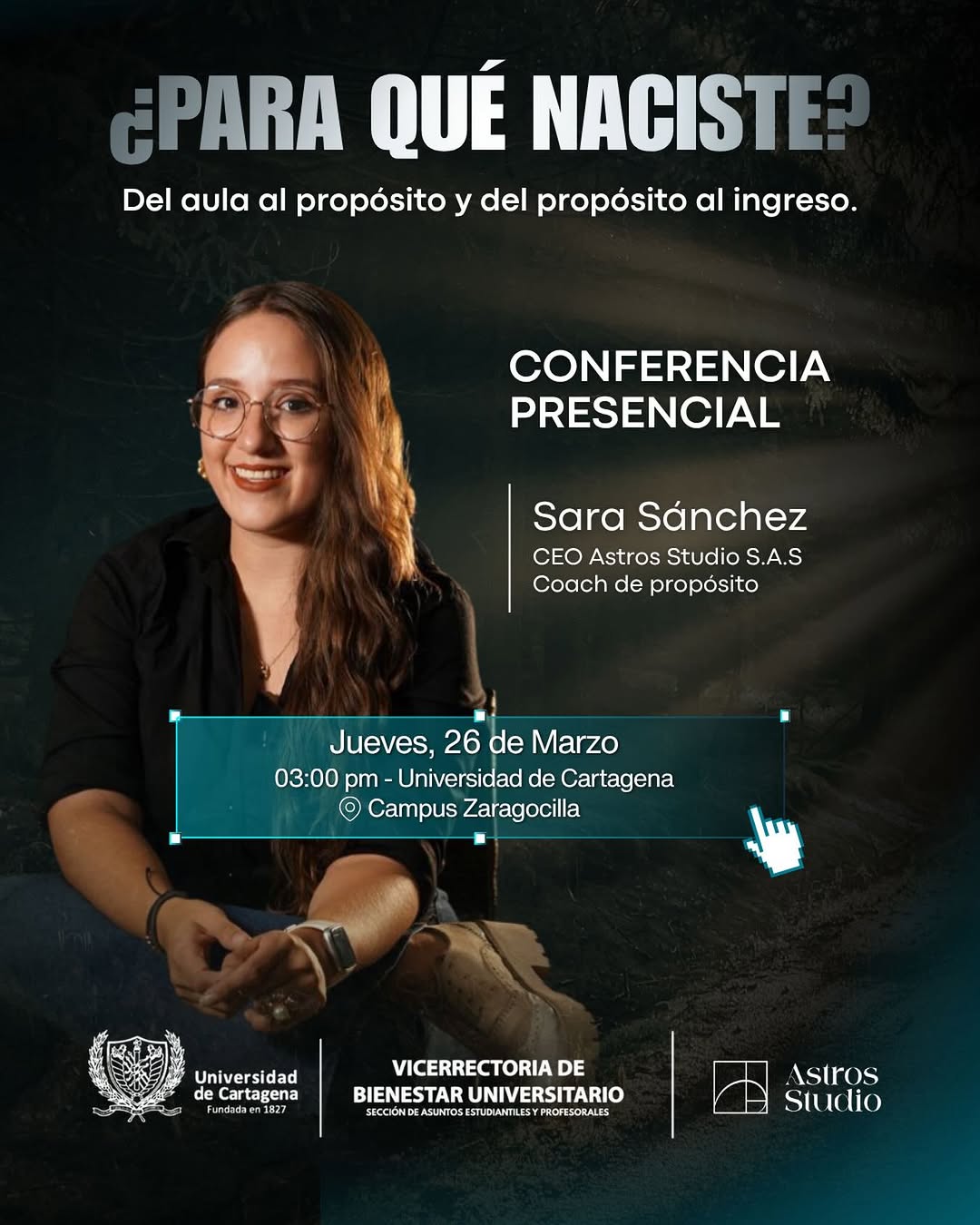 “¿PARA QUÉ NACISTE? Del aula al propósito y del propósito al ingreso” es una conferencia presencial en la Universidad de Cartagena, Campus Zaragocilla, donde la coach de propósito y CEO de Astros Studio, Sara Sánchez, acompaña a los asistentes a cuestionar su camino académico y profesional. En este espacio en Cartagena se exploran herramientas para conectar vocación, sentido de vida y generación de ingresos, orientado especialmente a estudiantes que quieren alinear su formación con un proyecto de vida significativo.