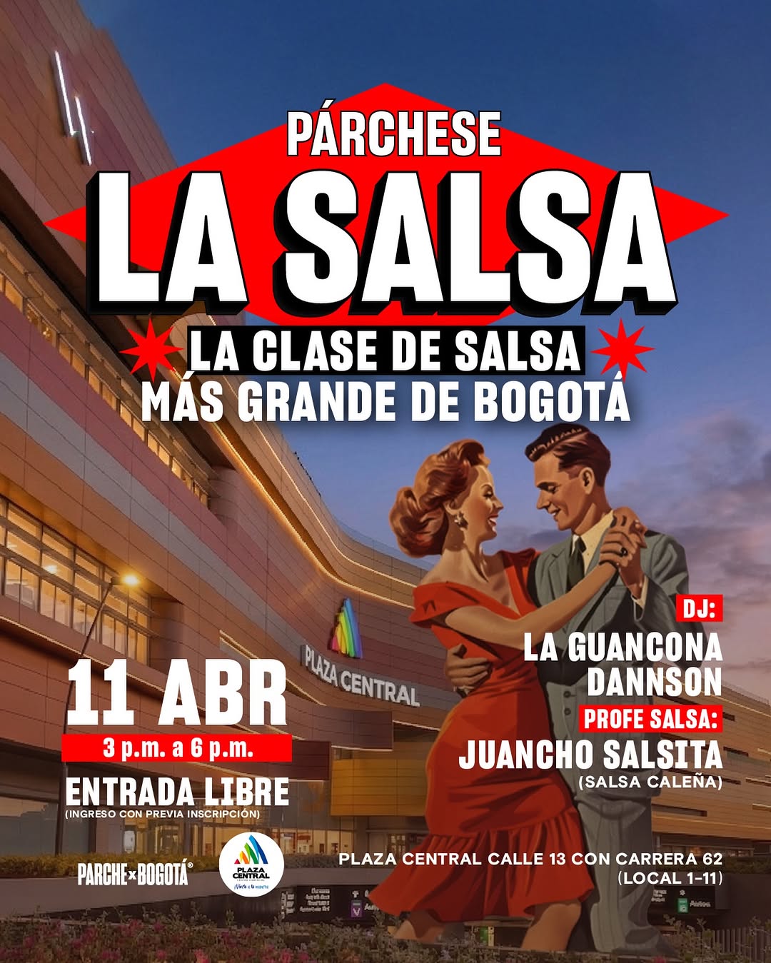 Párchese la Salsa llega a Bogotá con una edición especial de la clase de salsa más grande de la ciudad en Plaza Central. Será una sesión de baile guiada por Juancho Salsita, enfocado en salsa caleña, ideal para quienes quieren aprender pasos y técnicas mientras disfrutan de una selección musical salsera en vivo a cargo de La Guancona y Dannson. Un espacio perfecto para bailar, practicar y compartir con otros amantes de la salsa en Bogotá.