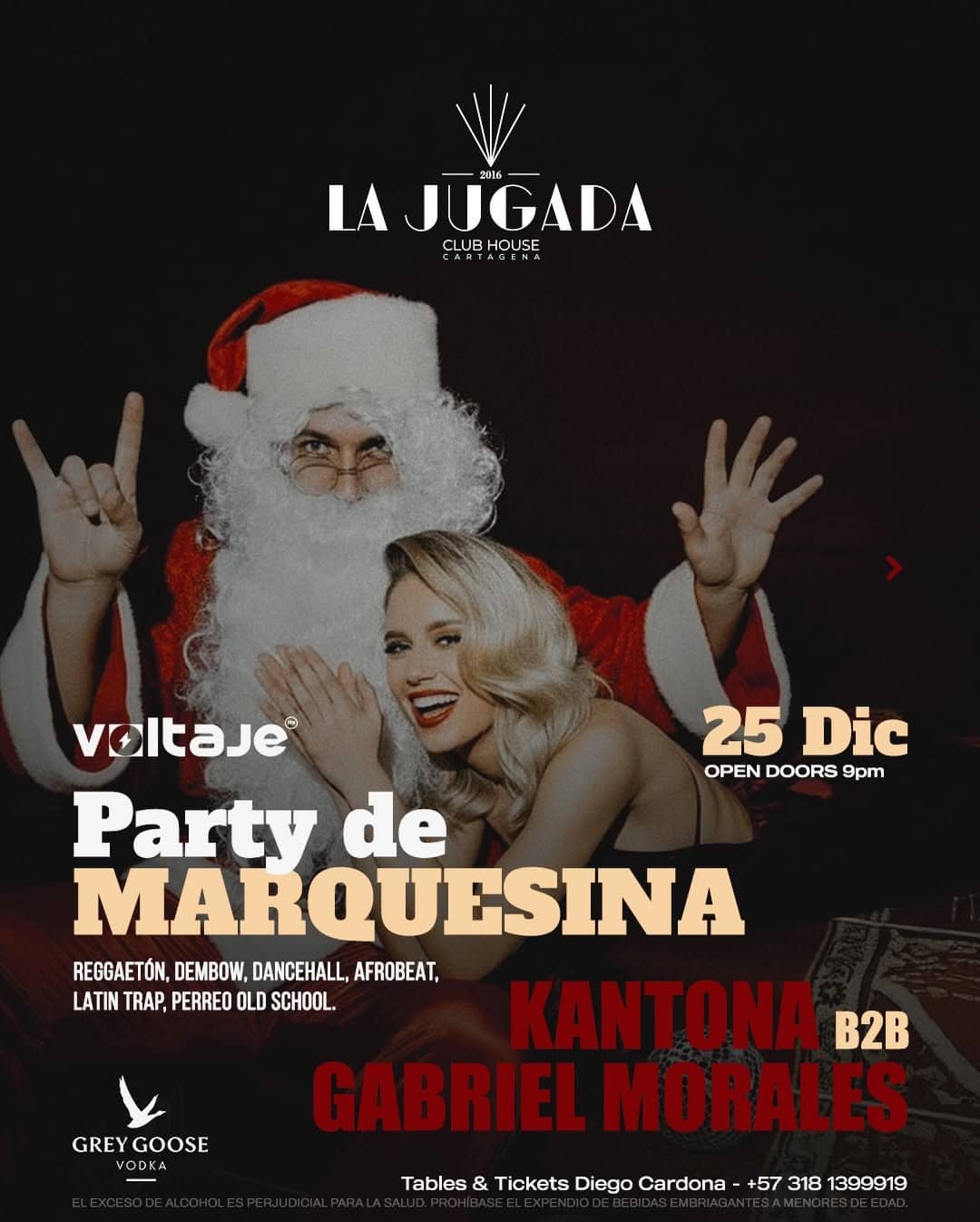 La Party de Marquesina es la fiesta de clásicos del reggaetón que estabas esperando para despedir el año en Cartagena. Con un B2B de los artistas Kantona y Gabriel Morales, la noche promete estar llena de energía y ritmo. Organizada por Voltaje, esta fiesta en La Jugada Club House te hará bailar al son de Reggaetón, Dembow, Dancehall, Afrobeat, Latin Trap y Perreo Old School. ¿Qué clásico le vas a pedir a Santa esa noche?