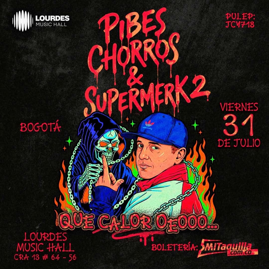 Pibes Chorros & Supermerk 2 llegan a Lourdes Music Hall en Bogotá para una noche dedicada a la cumbia villera y a los clásicos que han marcado la fiesta en el Cono Sur. Este concierto promete un ambiente intenso, caliente y fiestero, ideal para cantar y sudar de principio a fin junto a estas dos agrupaciones emblemáticas en un show cargado de energía y nostalgia.