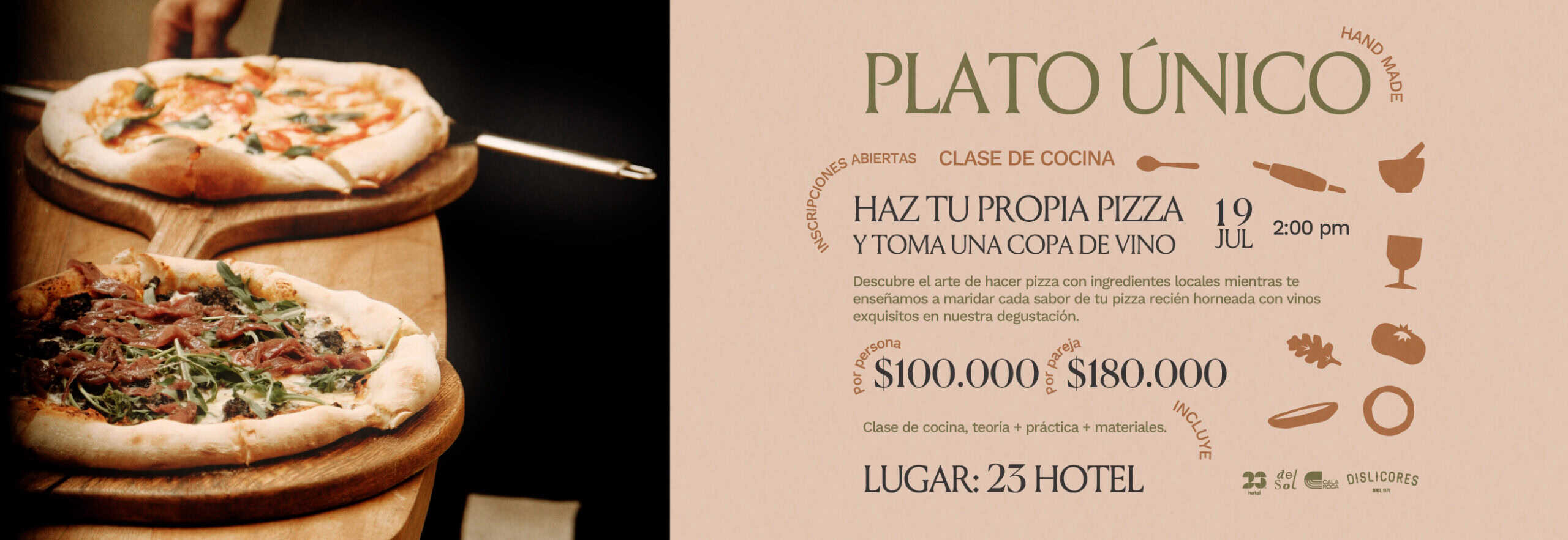 ¿Quieres aprender a hacer pizza? No te pierdas “Plato Único”, una clase de cocina donde podrás crear tu propia pizza deliciosa y disfrutar de una copa de vino. Descubre el arte de la pizza con ingredientes locales y aprende a maridar cada sabor con vinos exquisitos en nuestra degustación. La experiencia incluye una clase teórica y práctica, todos los materiales necesarios, ¡y mucha diversión!