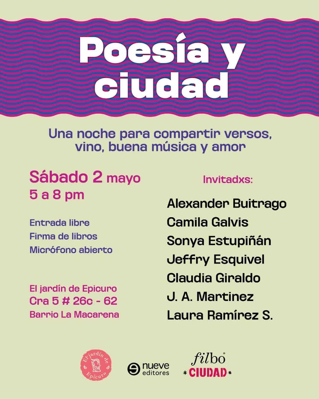 Poesía y ciudad es un encuentro de escritores y poetas en el Jardín de Epicuro, en Bogotá, en el marco de la FILBo. Será una noche dedicada a compartir versos, vino, buena música y amor, con espacios para firma de libros y micrófono abierto. Una oportunidad íntima y cercana para disfrutar de la literatura contemporánea y descubrir nuevas voces de la poesía en la ciudad.