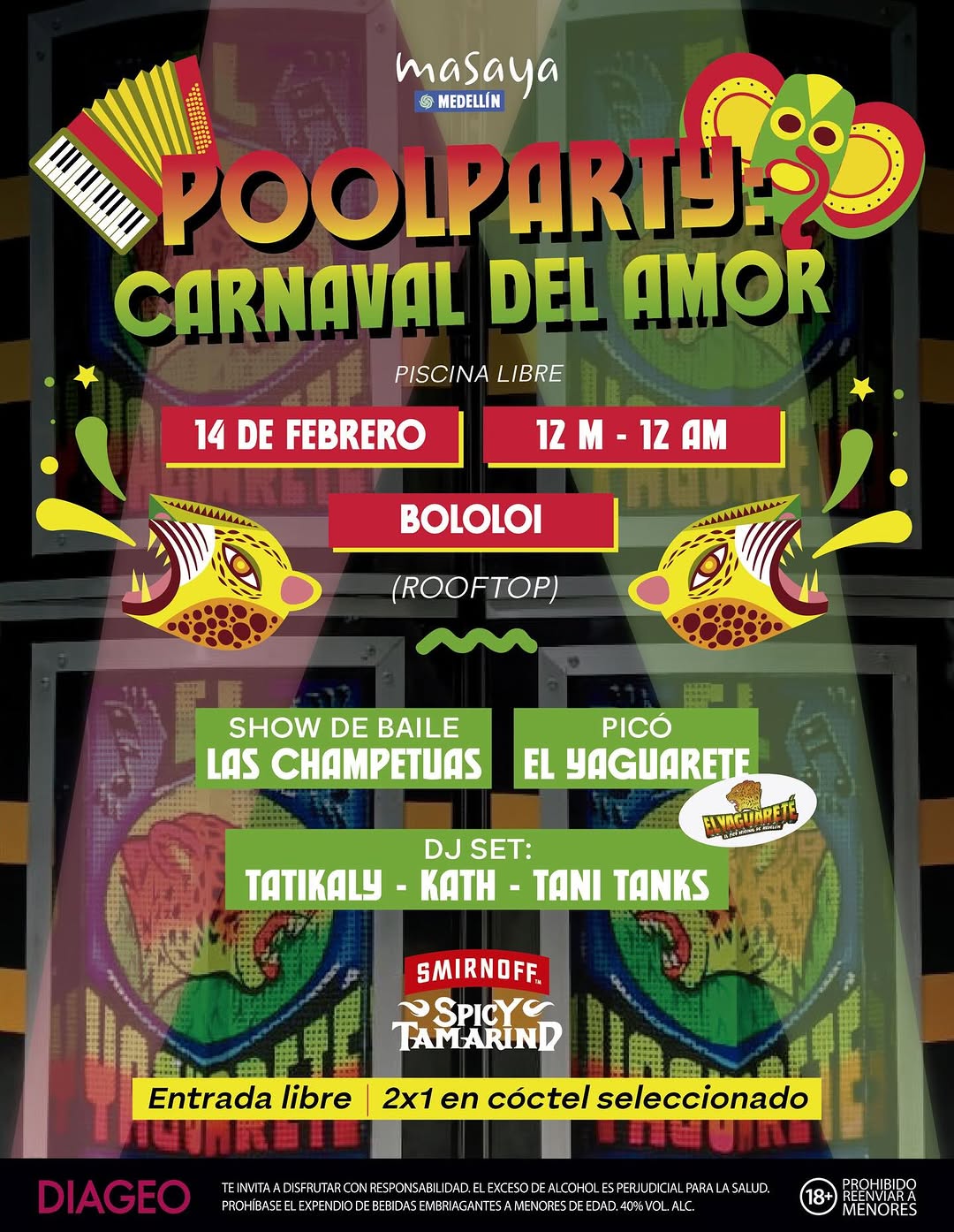 POOLPARTY: CARNAVAL DEL AMOR es una fiesta tipo pool party y carnaval en el rooftop de Masaya Medellín, ideal para disfrutar el Día del Amor en Medellín con música electrónica y tropical. Habrá show de baile a cargo de Las Champetuas, el picó El Yaguarete y DJ sets de Tatikaly, Kath y Tani Tanks, creando una experiencia festiva alrededor de la piscina, con ambiente caribeño y mucha rumba.