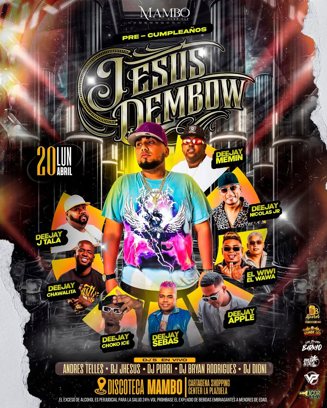 PRE – CUMPLEAÑOS JESUS DEMBOW es una fiesta tipo birthday bash con DJ set en vivo en Mambo, ideal para los amantes del perreo y el dembow en Cartagena. Durante dos noches se celebrará el cumpleaños del DJ Jesús Dembow junto a una nómina de DJs invitados como Deejay Memin, Deejay Nicolas Jr, El Wiwi El Wawa, Deejay Apple y otros, creando una rumba intensa, llena de energía, baile y música urbana sin pausas.