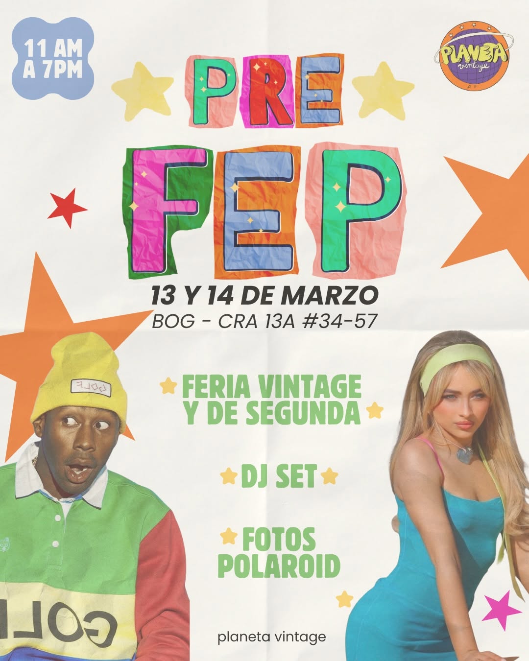 PRE FEP es una feria vintage y de segunda en Planeta Vintage, en Bogotá, pensada para quienes quieren armar su outfit para el Festival Estéreo Picnic. Encontrarás miles de prendas seleccionadas, ambientación musical con DJ set inspirado en los artistas del FEP y la posibilidad de llevarte fotos Polaroid. Es un espacio ideal para amantes de la moda sostenible y la cultura festivalera que buscan un look único y diferente.