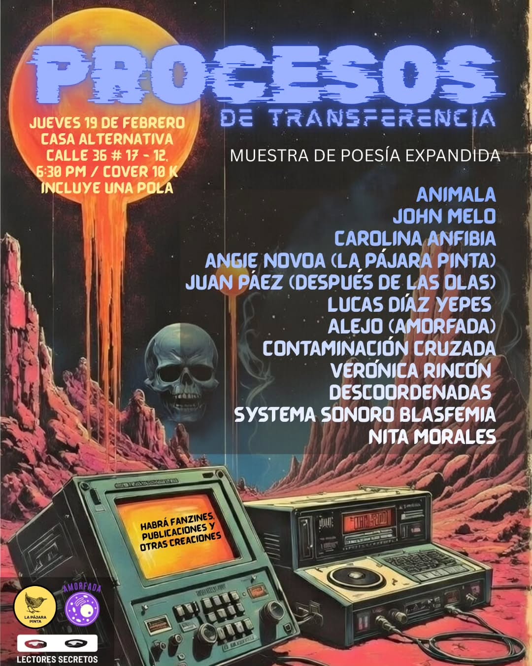 PROCESOS DE TRANSFERENCIA es una muestra de poesía expandida que reúne a diversas voces y propuestas experimentales en Casa Alternativa, en el sector de Teusaquillo en Bogotá. El evento combina lecturas, exploraciones sonoras y visuales, además de fanzines, publicaciones y otras creaciones independientes. Organizado por AMORFADA, La Pájara Pinta y Lectores Secretos, ofrece una experiencia íntima y alternativa para quienes buscan nuevas formas de poesía y arte contemporáneo en la ciudad.