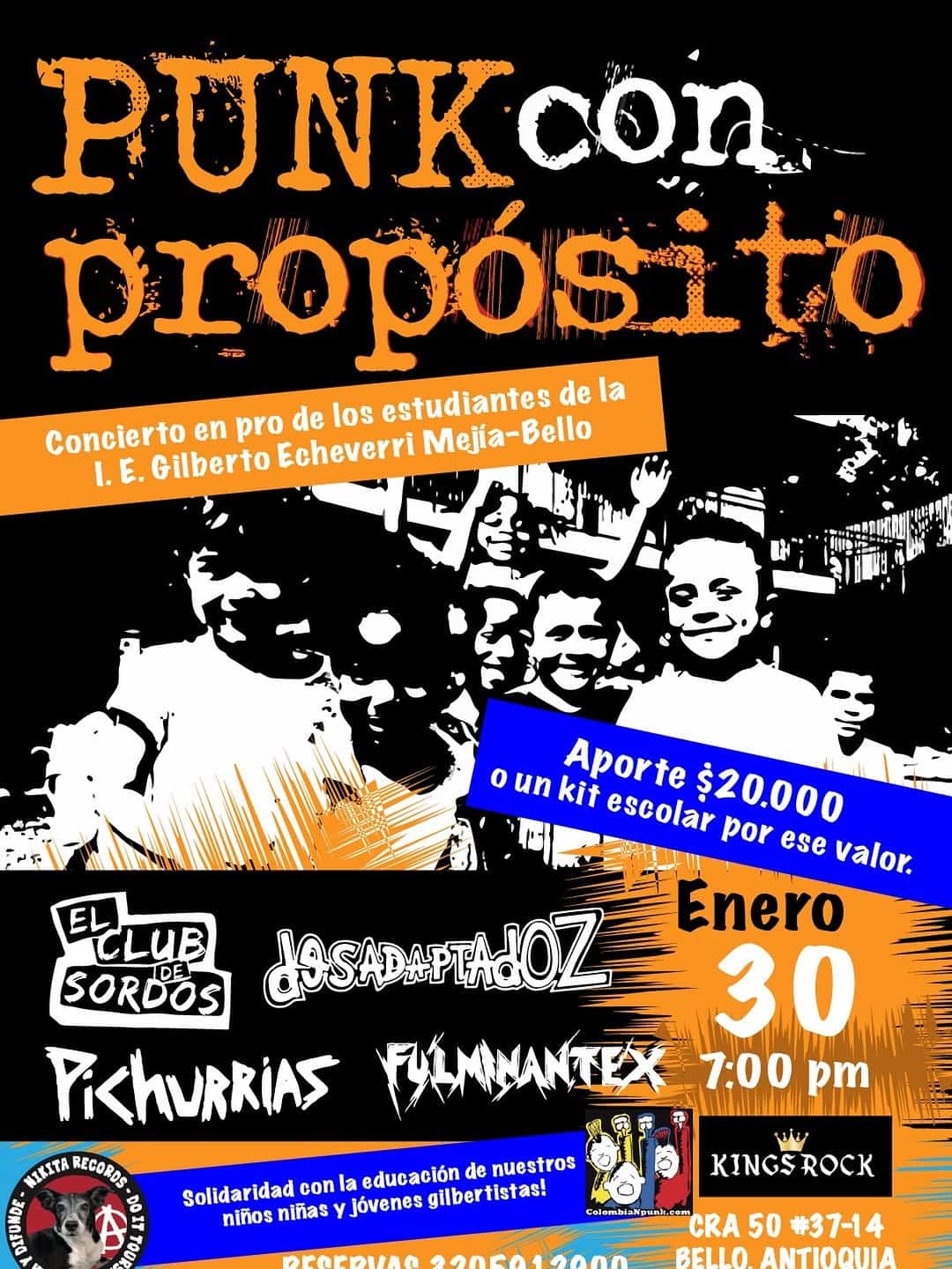 ¡Prepárate para una noche de punk con propósito en Bello, Antioquia! Este concierto benéfico, organizado por GRINDOGS THRASH RECORDS CREW, contará con la participación de bandas como EL CLUB DE LOS SORDOS, LOSADAPTADOZ, PICHURRIAS y FULMINANTEX. El evento se llevará a cabo en KINGS ROCK, un lugar conocido por su vibrante escena musical. Pero no es solo música lo que está en juego, tu aporte irá destinado a kits escolares para los estudiantes de la I.E. Gilberto Echeverri Mejía-Bello. ¡Ven y apoya la educación de nuestros niños y jóvenes gilbertistas!