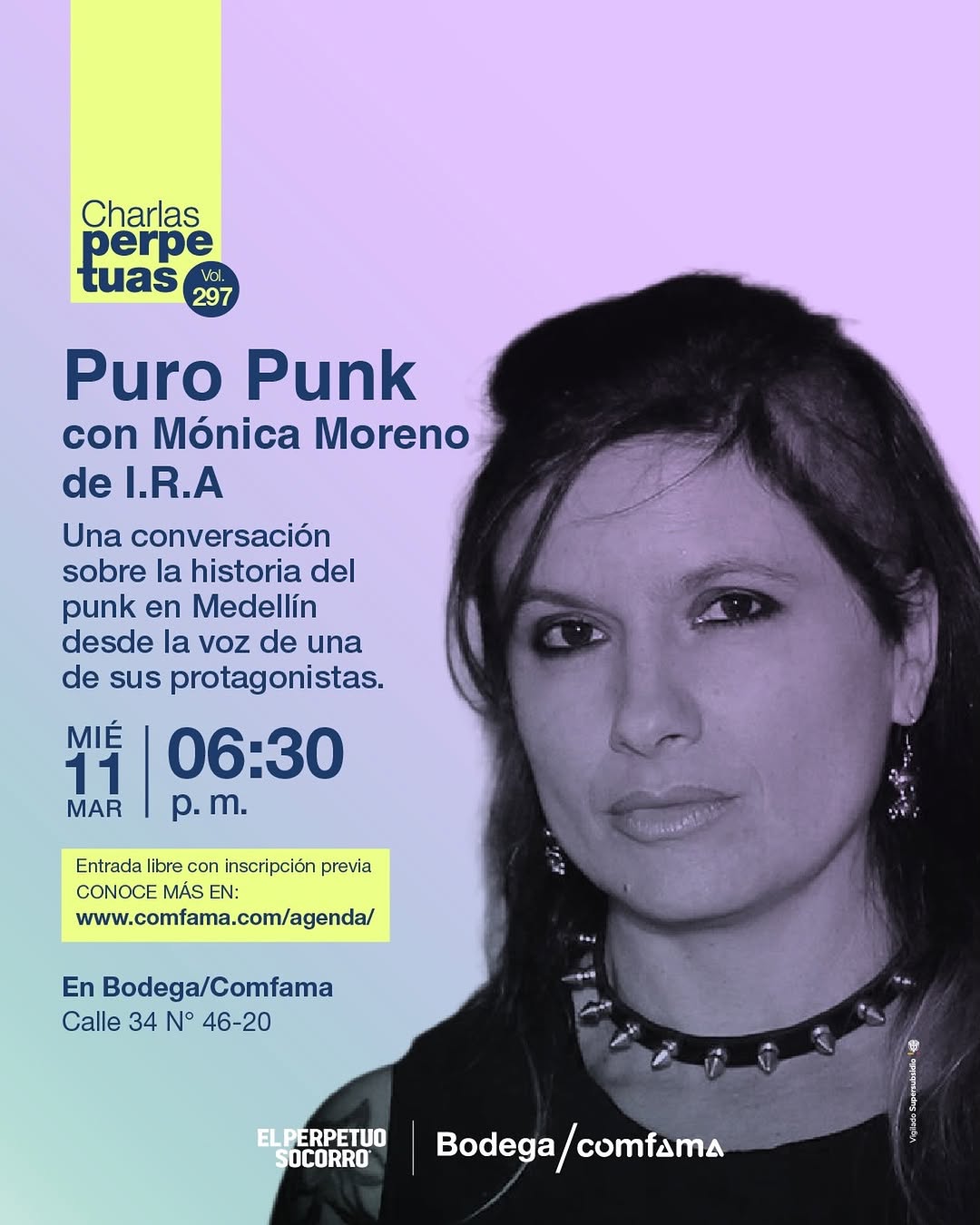 Puro Punk con Mónica Moreno de I.R.A es una charla del ciclo Charlas perpetuas en Bodega Comfama, en Medellín. En este espacio, Mónica comparte vivencias y memorias sobre la historia del punk en Medellín desde la mirada de una protagonista clave de la escena. Es una actividad ideal para quienes quieren entender el contexto cultural, social y musical del punk en la ciudad y su impacto en varias generaciones.