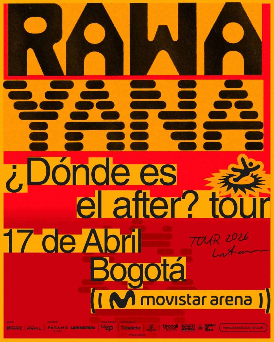 RAwa Yana llega a Bogotá con su tour 2026 “¿Dónde es el after? tour”, un concierto en el Movistar Arena que promete una noche llena de energía, fiesta y sonidos urbanos colombianos. Este show en vivo será una oportunidad para disfrutar de sus éxitos en un formato masivo, con una puesta en escena pensada para el público de la ciudad. Un plan ideal para quienes buscan un concierto vibrante y lleno de ambiente.