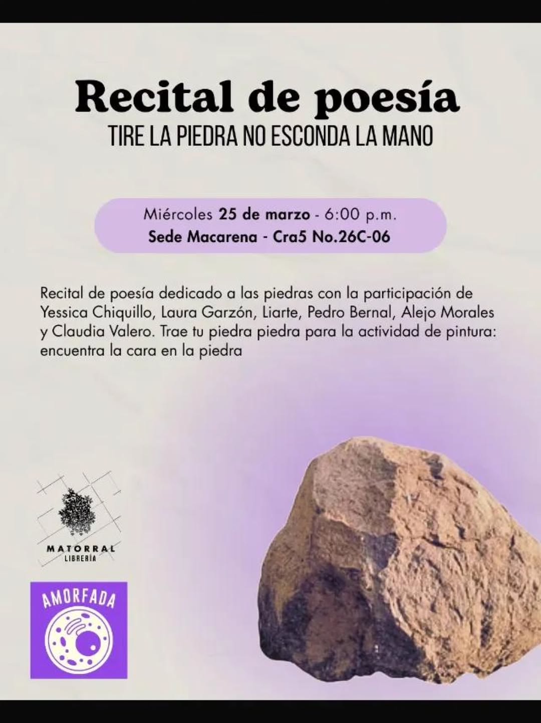 “Recital de poesía TIRE LA PIEDRA NO ESCONDA LA MANO” es un encuentro literario en Matorral, sede Macarena, donde la poesía gira en torno a las piedras como símbolo y objeto creativo. Poetas como Yessica Chiquillo, Laura Garzón, Liarte, Pedro Bernal, Alejo Morales y Claudia Valero compartirán textos cargados de imágenes y sedimentos emocionales. El público debe llevar su propia piedra para intervenirla con pintura al final de la lectura, creando una experiencia íntima y lúdica de literatura y arte en Bogotá.