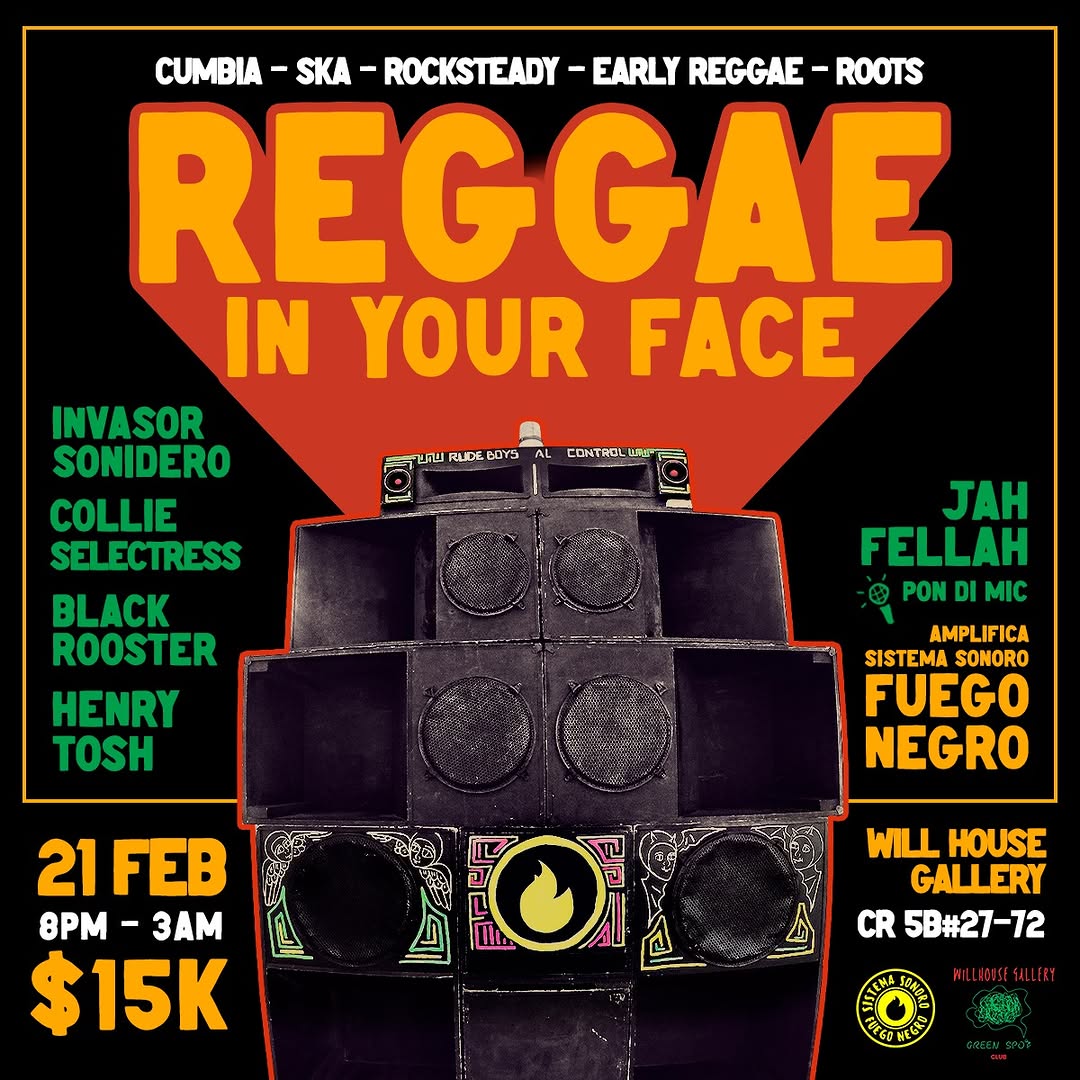 REGGAE IN YOUR FACE es una fiesta y concierto de sonidos jamaicanos que reúne cumbia, ska, rocksteady, early reggae y roots en Will House Gallery, con la curaduría de Green Roots Club en Bogotá. En tarima y cabina se presentan Invasor Sonidero, Collie Selectress, Black Rooster, Henry Tosh, Jah Fellah y el sistema sonoro Fuego Negro, para una noche intensa de vinilos, cultura sound system y vibra reggae hasta tarde.