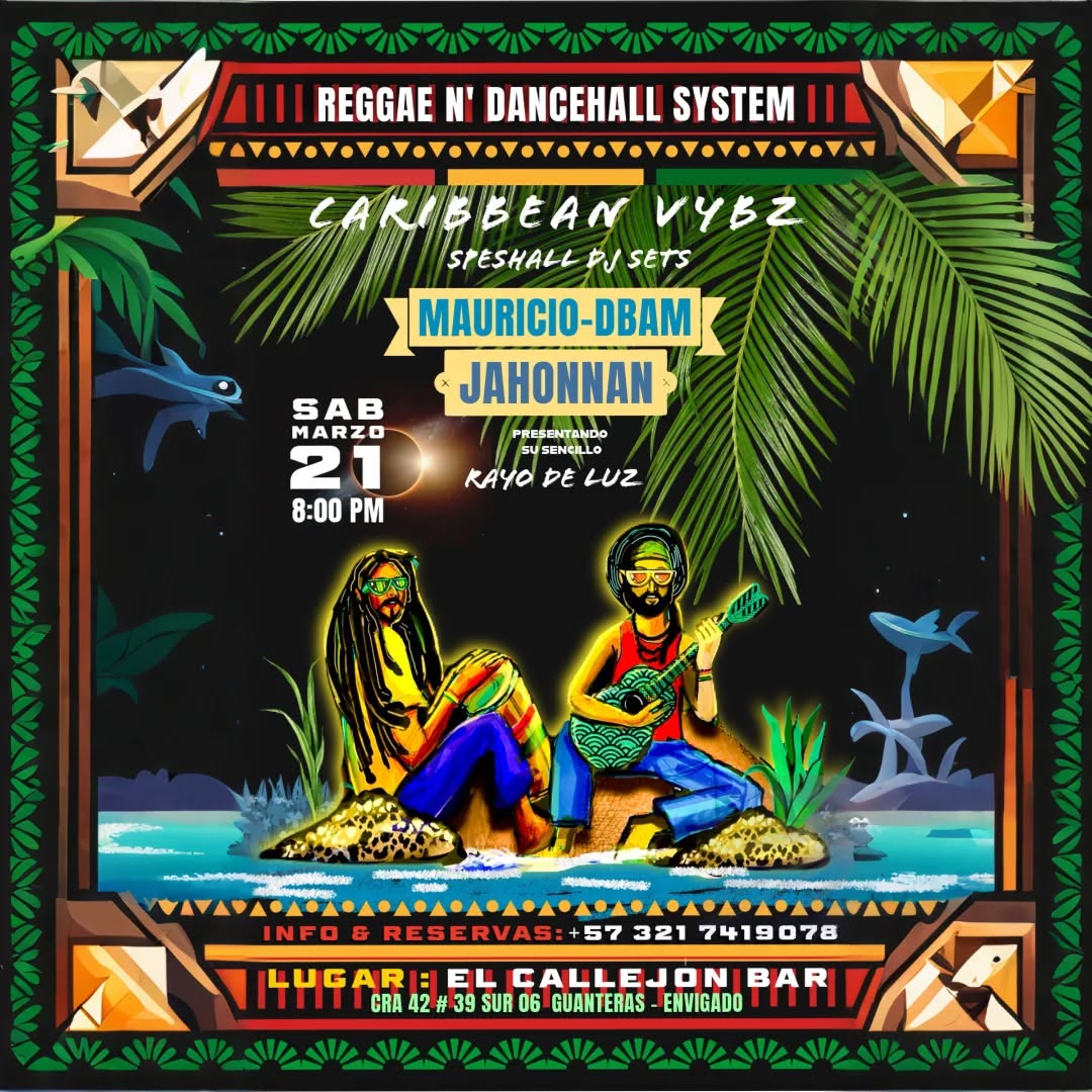 CARIBBEAN VYBZ es una noche de REGGAE N’ DANCEHALL SYSTEM en El Callejón Bar, en Envigado, donde Mauricio-DBAM y Jahonnan se unen en un DJ set especial para presentar en vivo el sencillo “Rayo de Luz”. Este evento de música reggae y dancehall promete una pista llena de energía caribeña, sonidos de sound system y buena vibra para quienes buscan una experiencia musical alternativa en la ciudad.