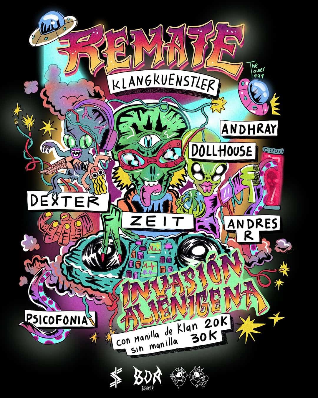 REMATE – Invasión Alienígena es una fiesta de música electrónica en PSICOFONIA, con un cartel encabezado por Klangkuenstler y el apoyo de Andhray, Dollhouse, Dexter, Zeit y Andrés R. Este evento temático promete una noche intensa de techno y sonidos contundentes, ideal para quienes buscan un after poderoso en Bogotá. Organiza BDR Bogotá, con una propuesta de invasión alienígena que combina música, energía y una atmósfera underground.