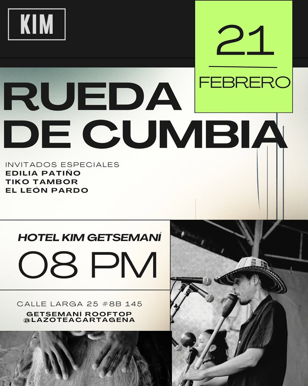 La Rueda de Cumbia llega a la terraza de La Zotea Cartagena con una noche dedicada a la cumbia y el bullerengue en Cartagena. El evento reúne a El León Pardo en la gaita, Edilia Patiño en la voz y la percusión tradicional para encender la fiesta en el rooftop del Hotel Kim en Getsemaní. Una experiencia musical y de baile alrededor de los tambores y la rueda, ideal para ir en parche y disfrutar de la tradición caribeña.